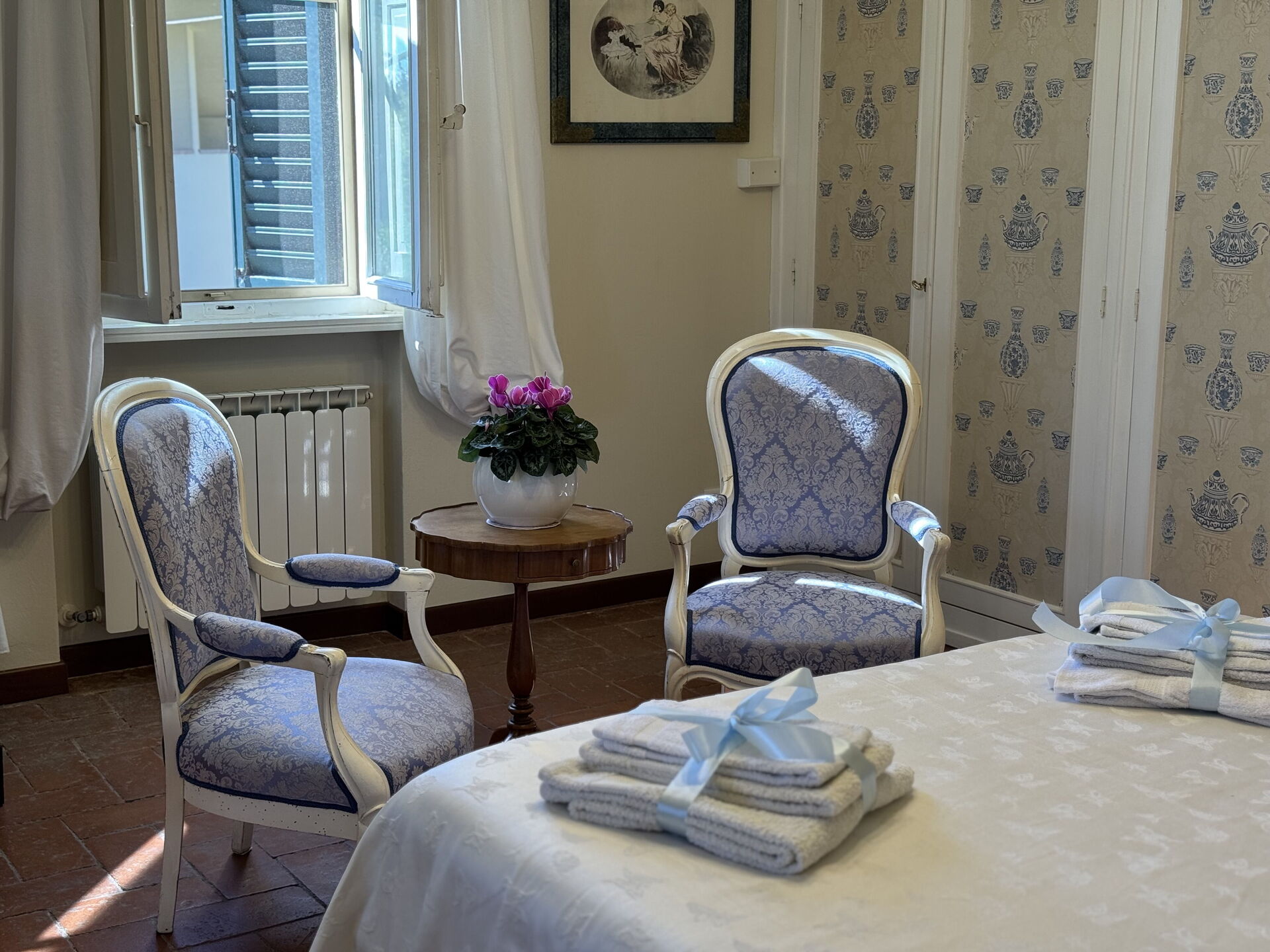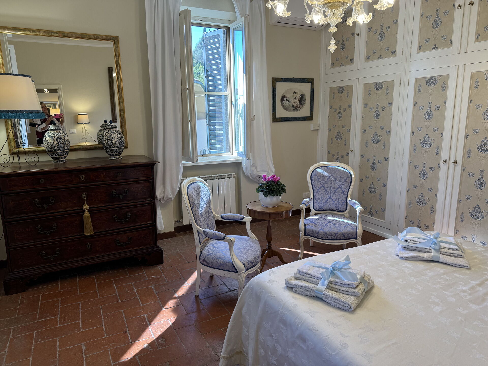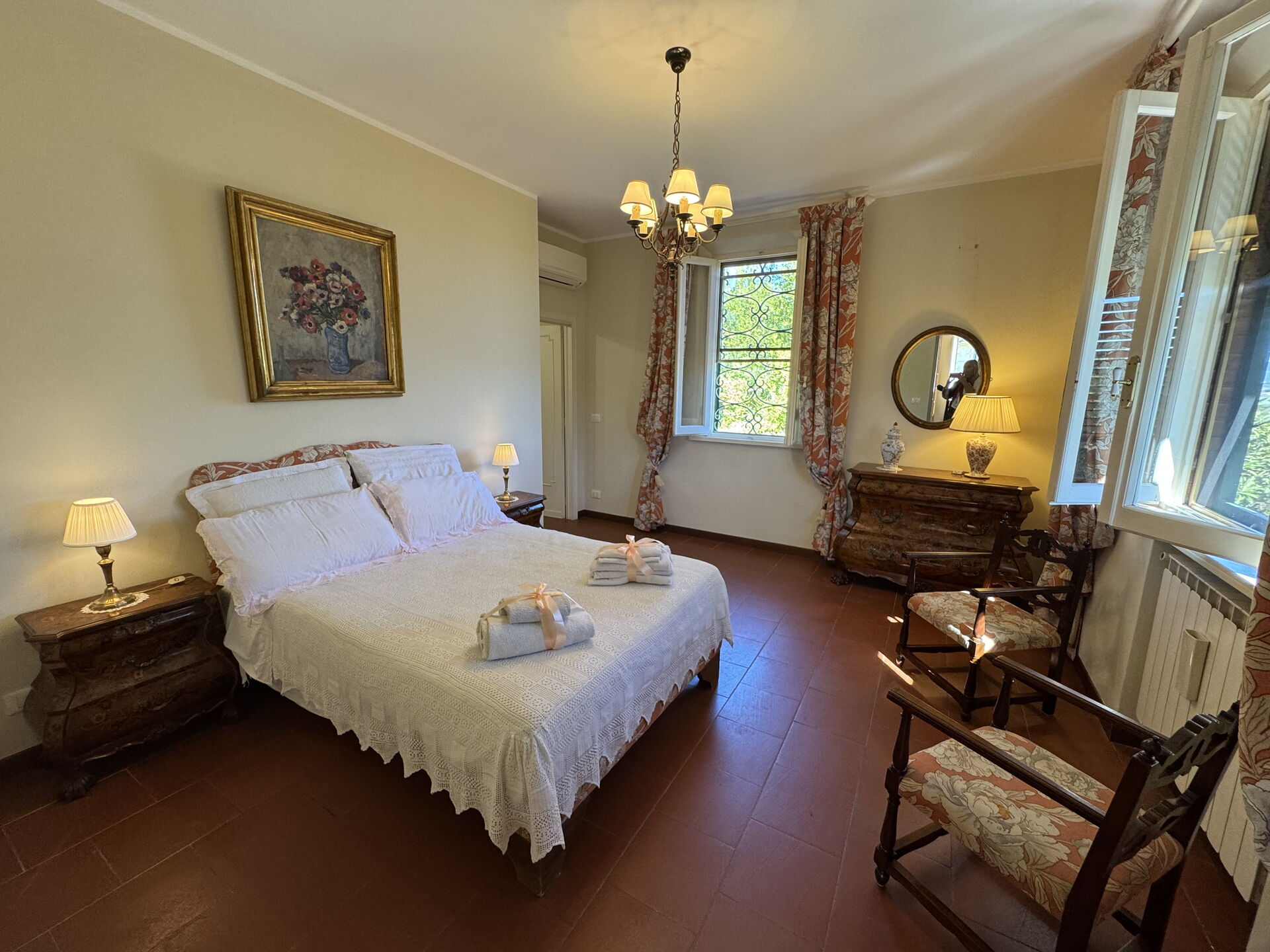 Bedroom + Ensuite Bathroom: double bed, air conditioning, mosquito net, armchair, basin, toilet, bidet, bathtub.