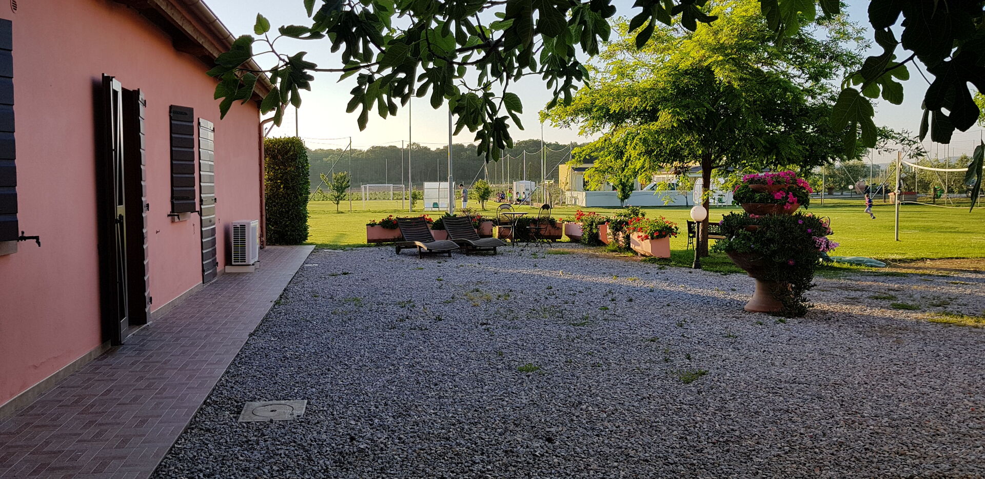 Sports area with football pitch and padel tennis court.