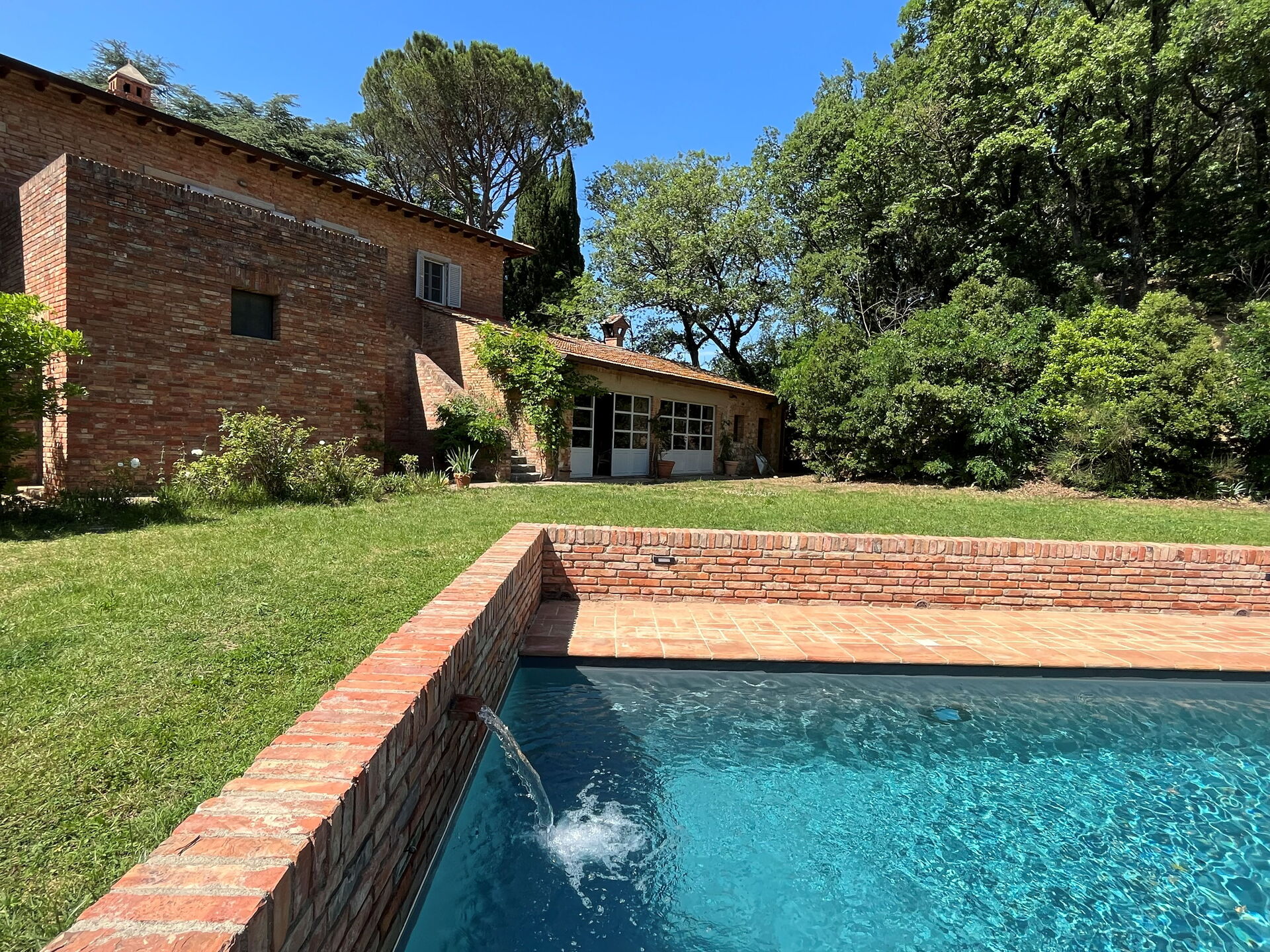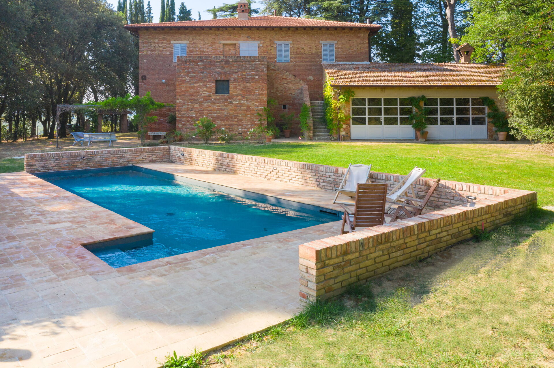 Garden: swimming pool (private, length: 12m, width: 3.6m, outdoor), barbecue, al fresco dining, dining table (people: 14), garden furniture, sunbed, fenced, enclosed property.