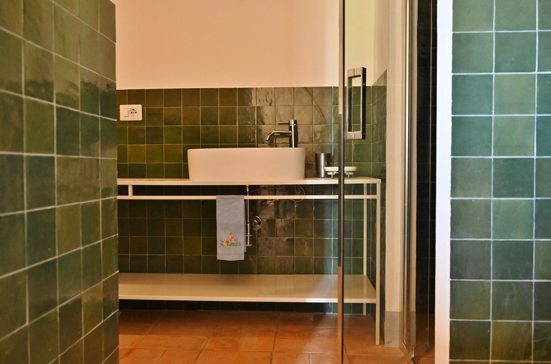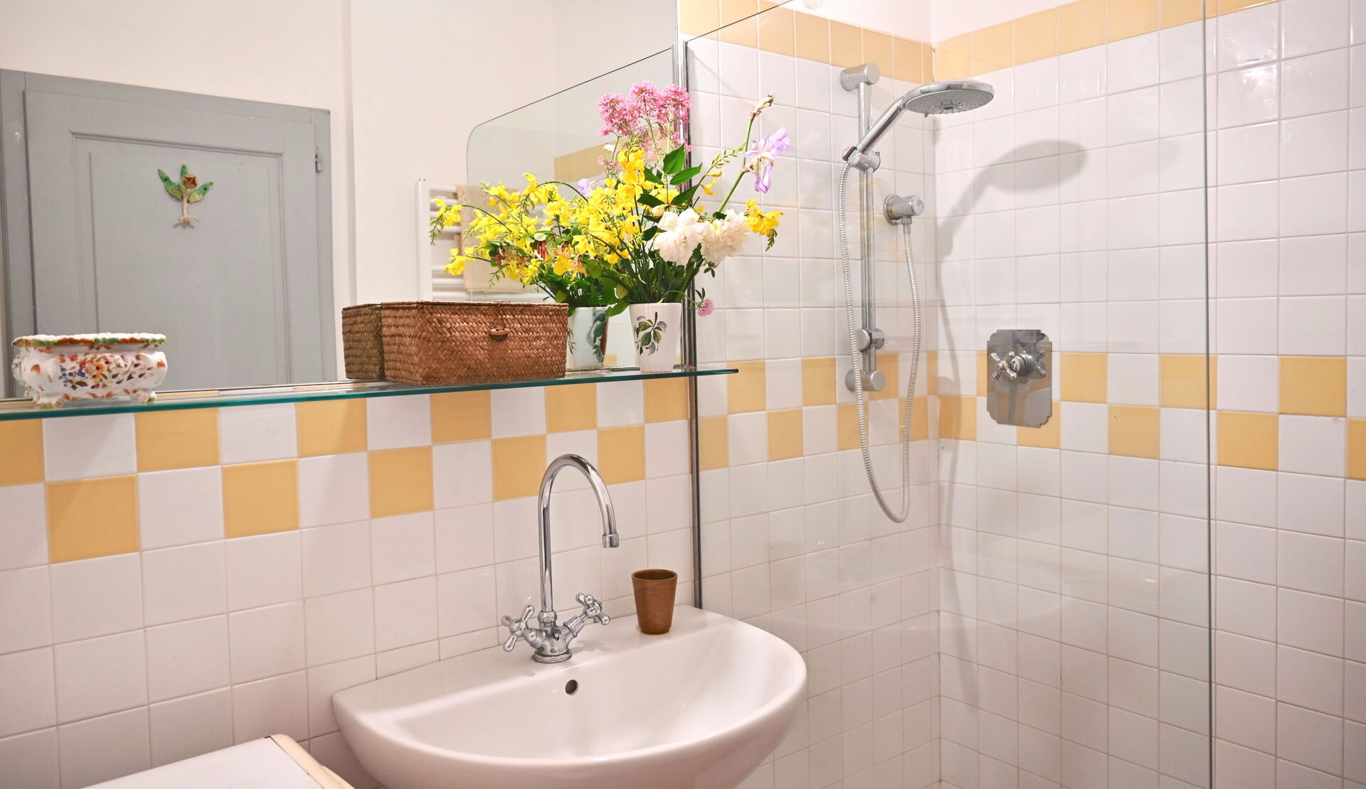 Bathroom: basin, toilet, shower.