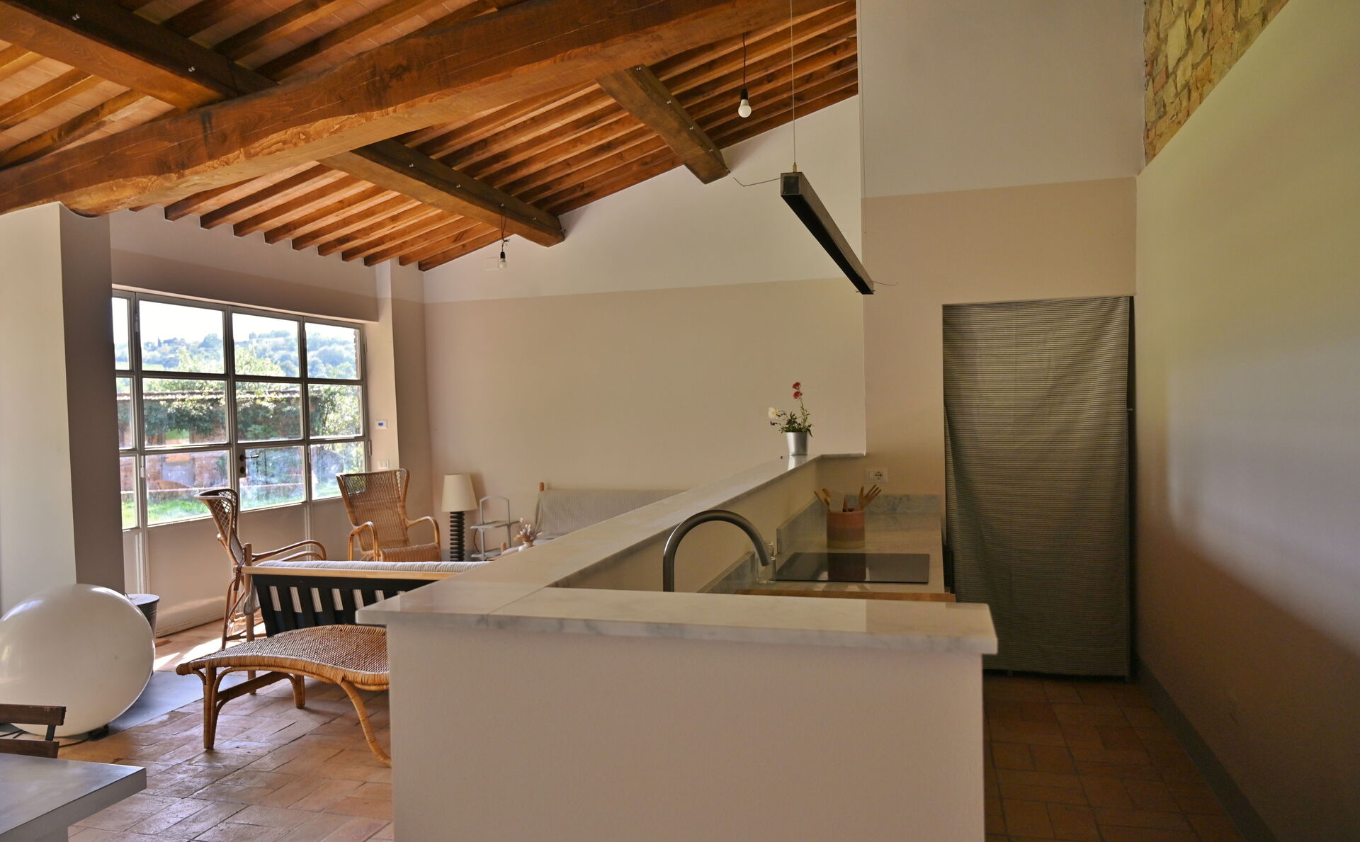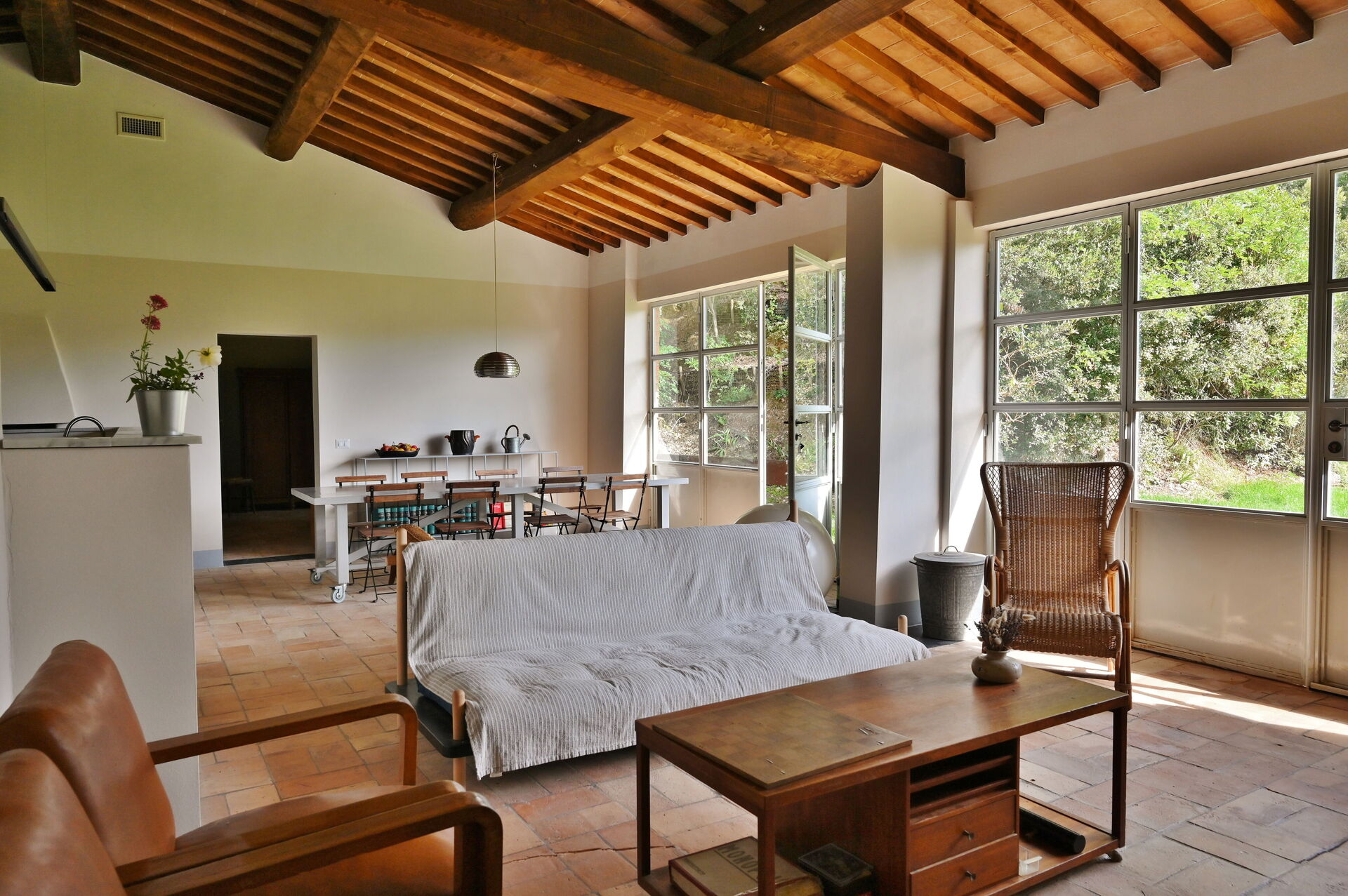 Kitchen + living room: well equipped kitchen, dining table, dishwasher, fridge, freezer, microwave, stove top, oven, italian coffee machine, american coffee machine, sofa, WIFI internet, internet, exit to the garden.