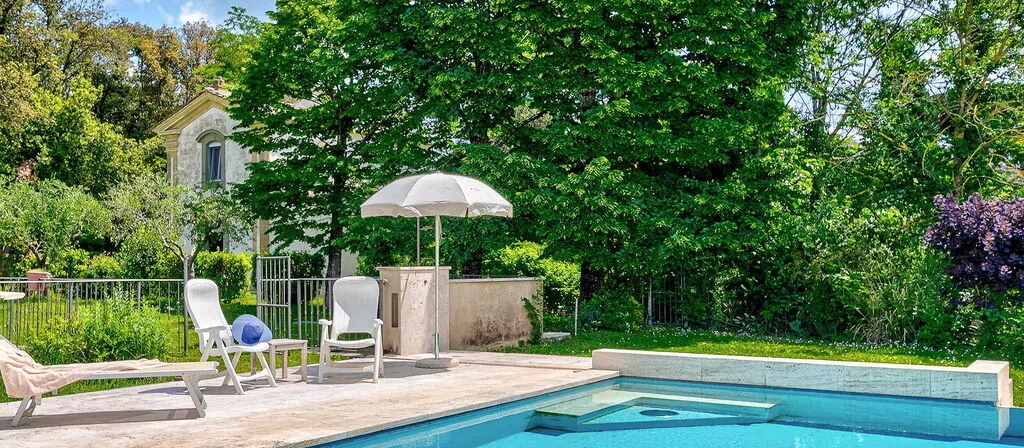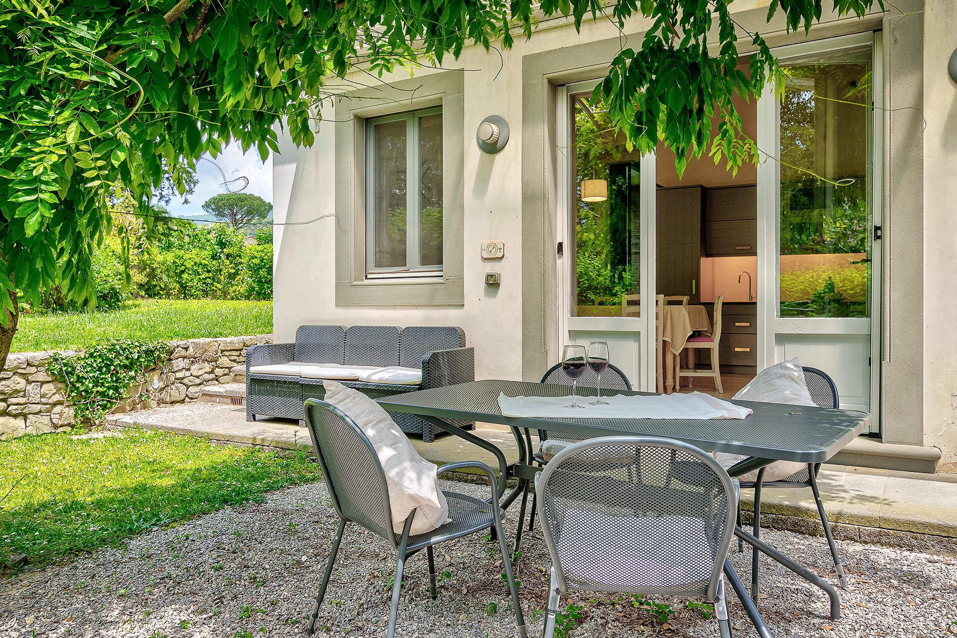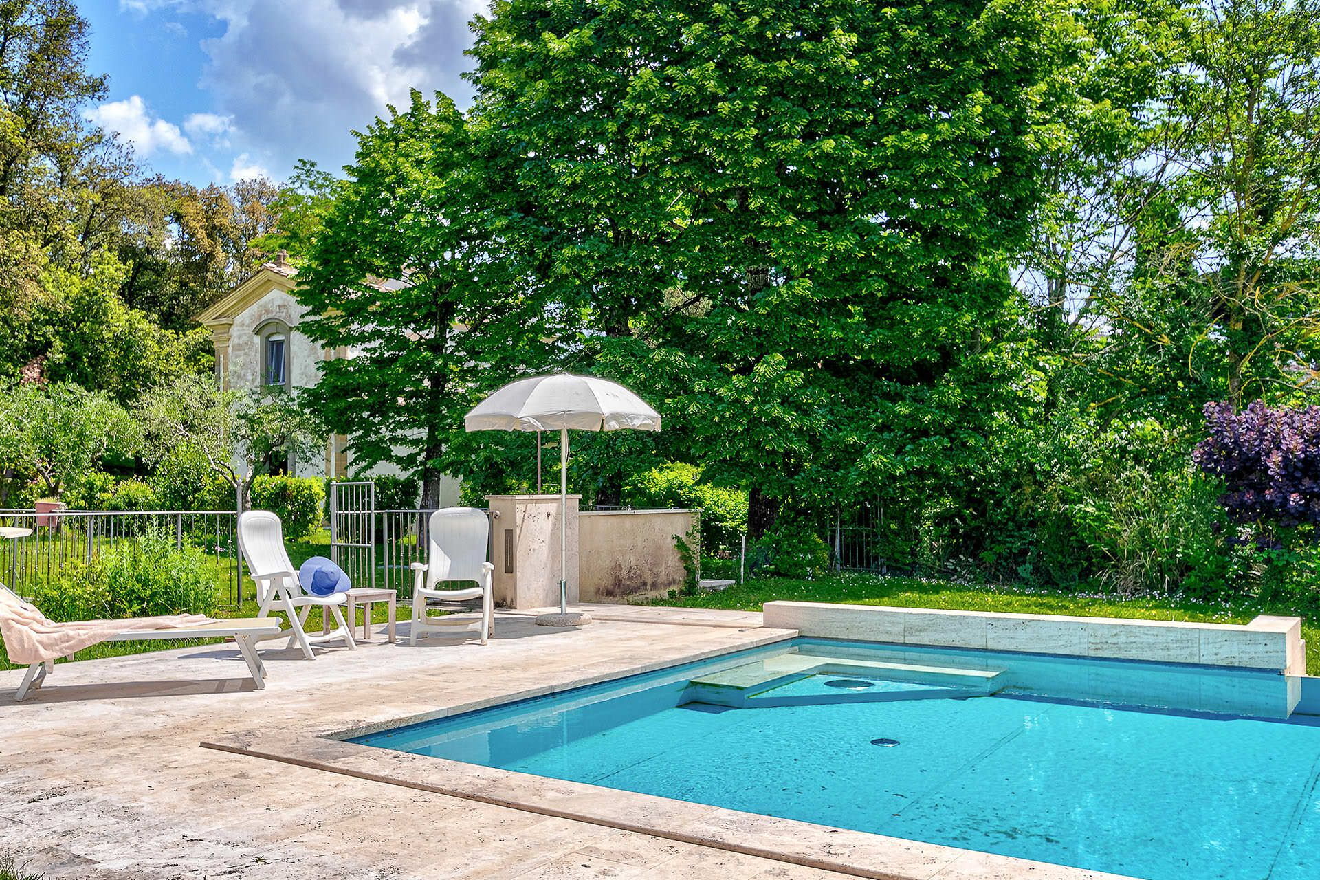 The outdoor spaces of Villa Church are as impressive as the interiors, inviting guests to fully embrace the beauty of the Tuscan landscape. The expansive private fenced garden of 1,200 square meters provides a generous and secure environment ideal for relaxation and outdoor living. At the heart of this green retreat, the private swimming pool is equipped with sunloungers and umbrellas, offering a comfortable and shaded space to unwind and soak up the Italian sunshine. Throughout the garden, carefully arranged outdoor furniture, including a table and chairs, creates an inviting setting for al fresco dining and leisurely gatherings in the open air, allowing guests to savour the tranquillity of the surrounding countryside at any time of day.