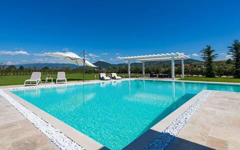 The villa is fully equipped with a comprehensive range of amenities designed to ensure a comfortable and enjoyable stay. A powerful air conditioning system covers the entire property, while heating is also available throughout, ensuring a pleasant atmosphere regardless of the season. The well-appointed kitchen benefits from a microwave and a dishwasher, complementing the broader selection of cooking appliances already in place. A washing machine is available for guests requiring laundry facilities during longer stays. For entertainment, each bedroom is equipped with a satellite television, and an additional television is located in the dedicated lounge and TV room. The covered private patio, furnished with a dining table, chairs, and a barbecue, serves as an ideal setting for outdoor meals with sweeping views of the surrounding Tuscan hills. The expansive private garden features a beautifully maintained lawn, a private swimming pool measuring 7x11 metres with an additional angled section of 4x5 metres, and elegant sun loungers with umbrellas. Adjacent to the pool, an internal SPA area includes an indoor heated hydromassage pool measuring 3.80 x 2.5 metres at a depth of 1 metre, a sauna of 4 sqm, a Turkish bath of 4 sqm, and 2 heated relaxation beds. The SPA area is enclosed by large glass doors offering uninterrupted views of the landscape. Wireless internet connection is available throughout the villa.
