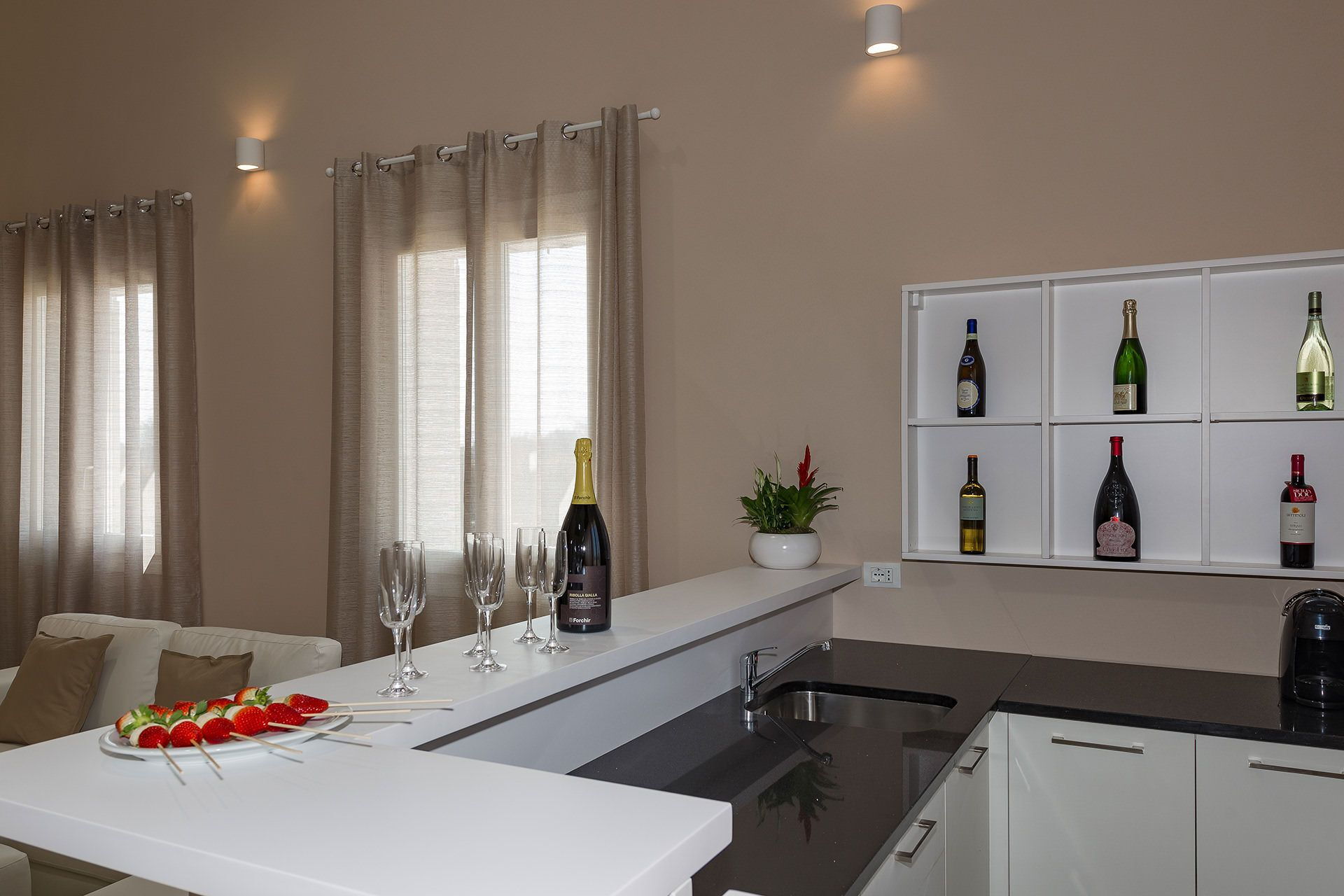 welcome basket with Prosecco, snacks and other drinks