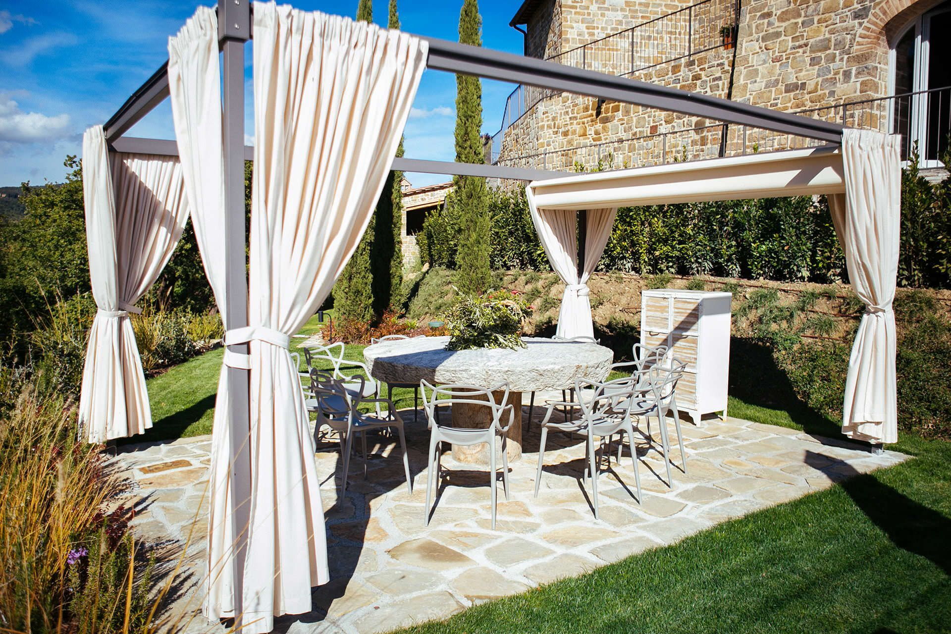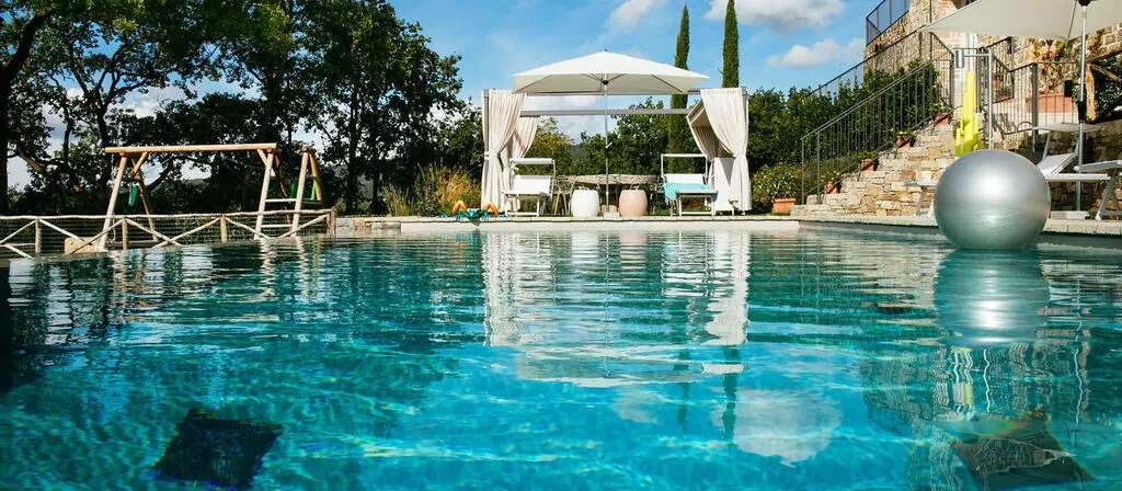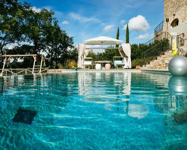 The outdoor spaces of Villa Torre del Chianti are thoughtfully designed to make the most of the stunning Tuscan surroundings. The centerpiece of the garden is a magnificent private swimming pool measuring 12x6 meters, with a depth ranging from 1.40 to 2.00 meters, which can be heated upon request to extend your enjoyment across different seasons. Surrounding the pool, elegant sun loungers, umbrellas, and a gazebo create an inviting atmosphere for long, leisurely afternoons in the sun. A dedicated playground for children ensures that younger guests are equally well catered for within the safety of the fenced garden. For outdoor dining, a covered area equipped with a table, chairs, and a barbecue provides the perfect setting to enjoy al fresco meals while taking in the peaceful countryside atmosphere. The private fenced garden wraps around the entire property, offering both beauty and privacy in equal measure.