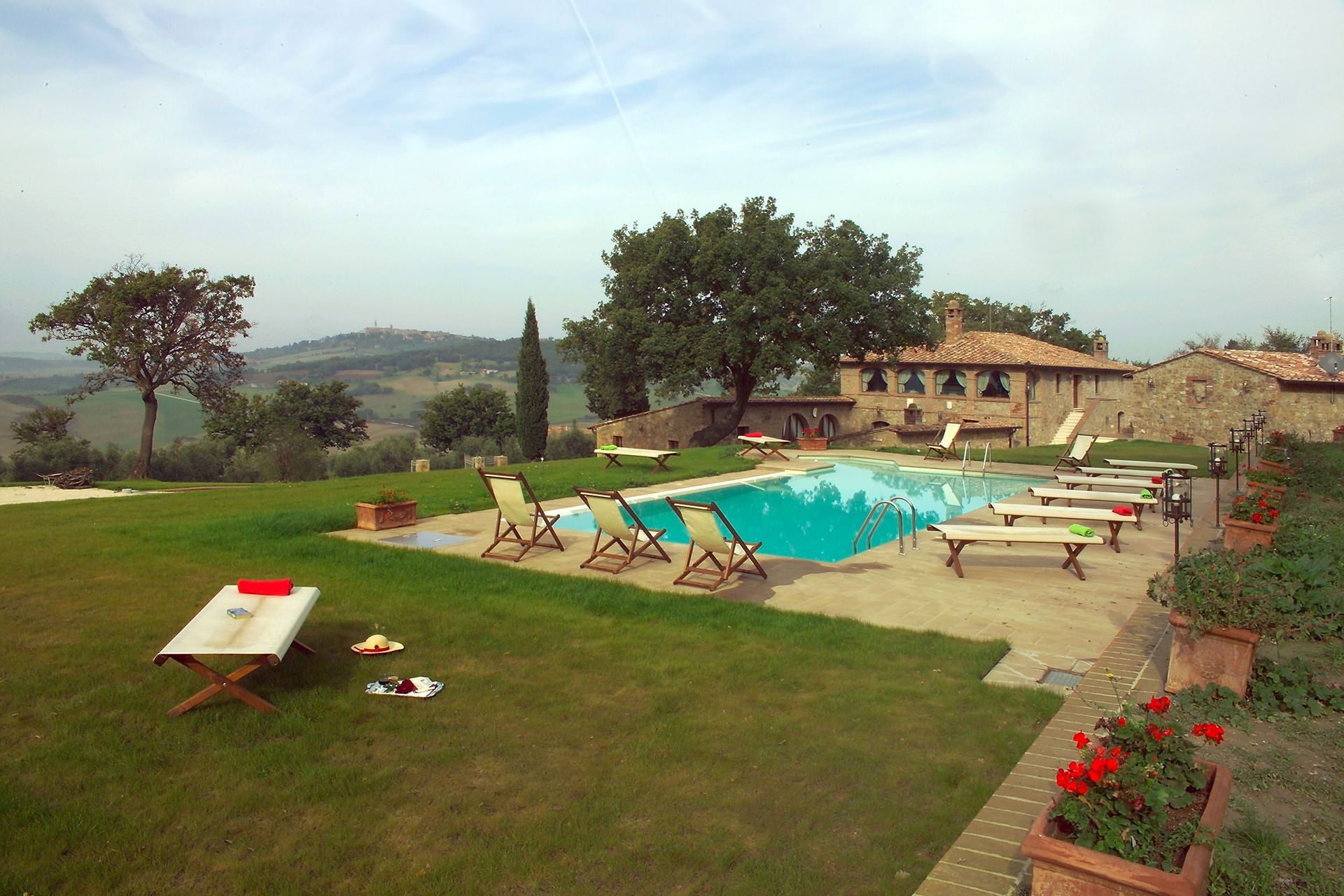 Villa Monticchiello is situated in the heart of the Orcia Valley, surrounded by vineyards and the characteristic Tuscan countryside. The hamlet of Monticchiello, offering basic services including a grocery store and a restaurant, is just 2 km away. The nearest larger town is Pienza at 5 km, followed by Chianciano Terme with a train station at 10 km, Montepulciano at 13 km, Cortona at 25 km, Montalcino at 34 km, Siena at 54 km, Arezzo at 56 km, Perugia at 65 km, Florence Airport at 110 km, and Rome Airport at 175 km.
