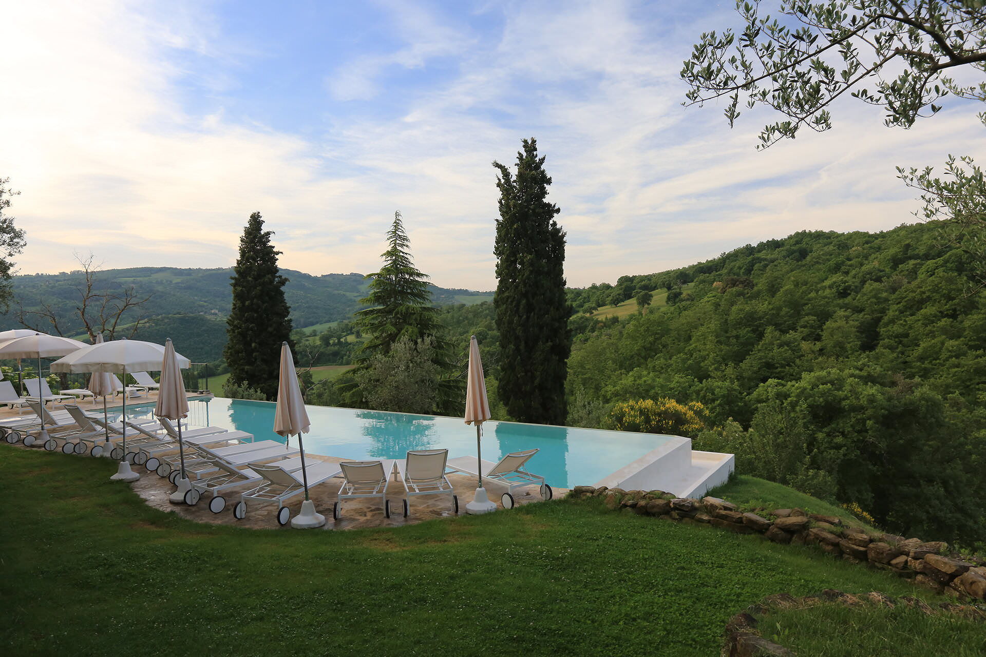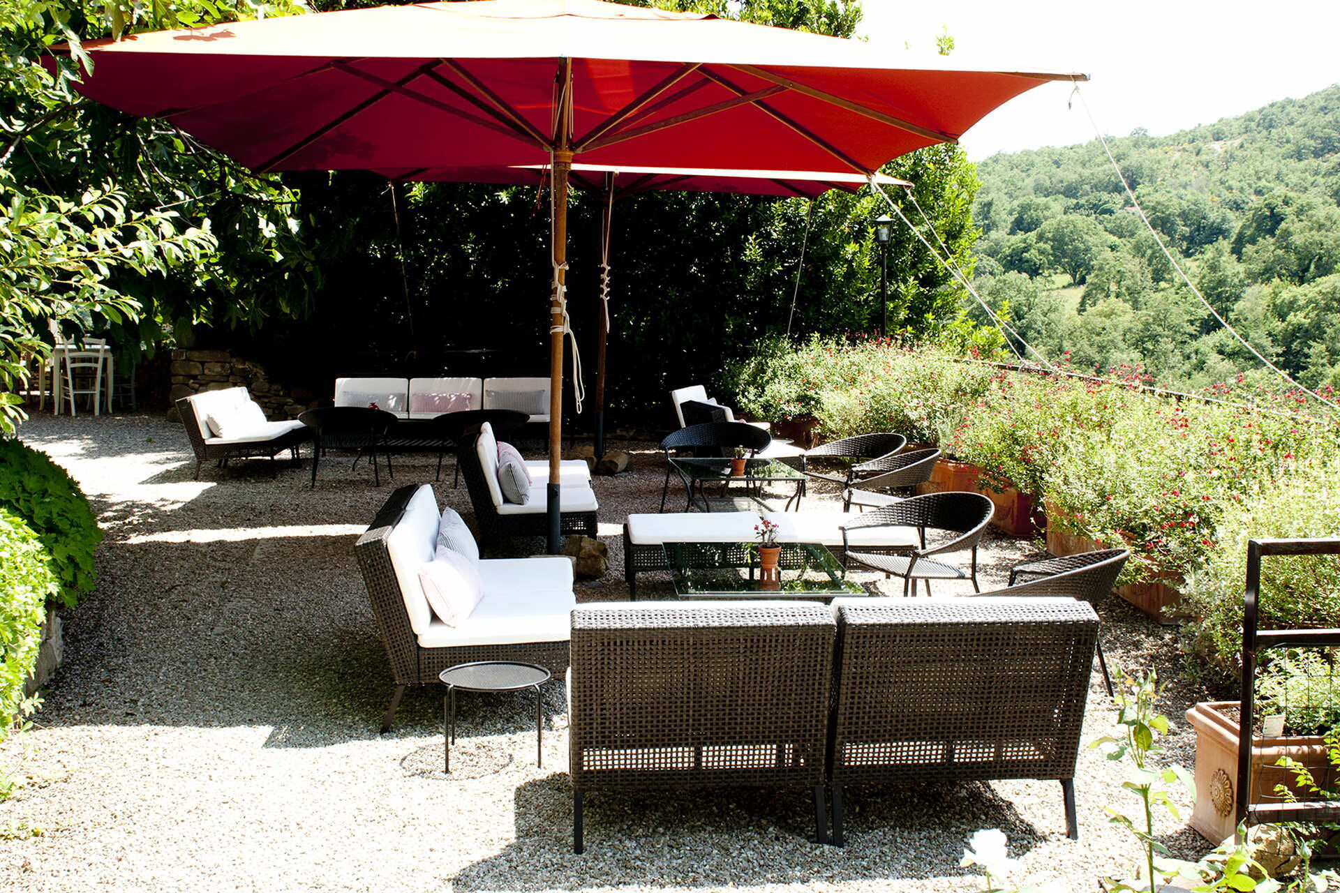 The outdoor spaces at Borgo di San Biagio are as extraordinary as the interiors, offering a seamless blend of curated landscaping and unspoiled natural scenery. A large panoramic terrace, furnished with a comfortable lounge area and a dedicated al fresco dining space, provides the perfect setting for relaxed gatherings and open-air meals with views over the surrounding countryside. Just a short walk from the terrace, the saltwater infinity pool and adjacent solarium are set within the estate's beautifully landscaped gardens, creating an atmosphere of serene retreat. The pool's elevated position along the rocky ridge allows it to overlook an unspoiled valley, offering guests a profound sense of peace and connection with nature. Each of the six annex bedrooms opens directly onto its own private terrace, providing intimate outdoor spaces for individual relaxation. Beyond the formal garden areas, the property's 14 hectares of private land include centuries-old olive groves and a thriving organic vegetable garden, inviting guests to explore and enjoy the estate's natural abundance across approximately 35 acres of protected countryside.