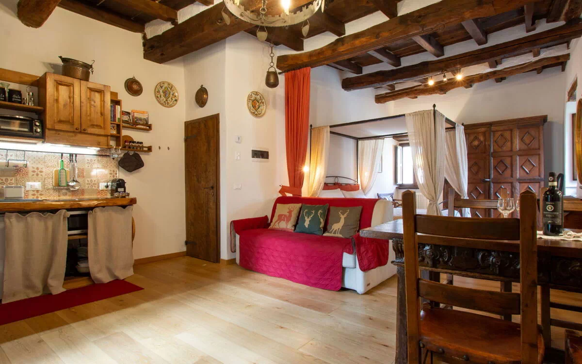 "Maghinardo" is a charming 1-room apartment of 42 m2, situated on the 1st floor, and designed to accommodate a maximum of 4 guests. The apartment features 1 bedroom equipped with 1 double bed and an open-hearth fireplace, which serves as a decorative element. The living and sleeping area includes 1 sofabed, offering flexible sleeping arrangements for additional guests. The kitchen is fully integrated into the living space and comes with a dining table, making it a practical and welcoming area for meals. The bathroom is composed of a shower, bidet, and WC, representing the 1 bathroom available in the unit. Wooden floors run throughout the apartment, adding warmth and character to the overall aesthetic. A private patio of 8 m2, partly roofed and furnished with terrace furniture, can be accessed directly from both the living area and the kitchen, offering a beautiful view of the city.
