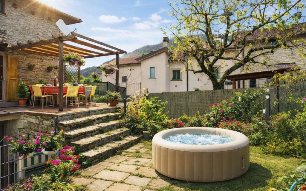 The private terraced garden of "Torre" extends across approximately 200 square metres and is fully fenced, providing a secure and secluded outdoor retreat exclusively for your use. This beautifully maintained exterior space is thoughtfully equipped to encourage relaxation and outdoor living at its finest. A hot tub invites you to unwind beneath the open sky, while an outdoor shower adds a practical touch of convenience after time spent in the garden. A barbecue station is on hand for al fresco dining, and garden furniture is provided to create a comfortable setting for meals, conversation, or simply enjoying the surrounding landscape. A dedicated children's playground within the garden ensures that younger guests are entertained and safe throughout their stay.