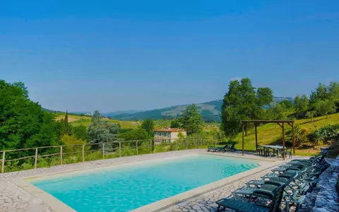 The outdoor spaces of Villa Nicoletta are a true highlight of the property, inviting guests to immerse themselves in the serene natural surroundings. The expansive private garden, fully fenced and covering an area of 5,500 m2, is home to magnificent centuries-old trees that provide shade and a sense of timeless grandeur. The swimming pool, located just 150 m from the villa, reaches a depth of between 90 and 140 cm and is available for seasonal use from May 18th to September 28th, welcoming guests daily from 10:00 to 19:00 hours. An outdoor shower is conveniently provided for use in connection with the pool area. The garden is thoughtfully equipped with outdoor furniture, creating comfortable spaces to relax and take in the panoramic views of the surrounding hills. A barbecue is also available, making the outdoor dining area an ideal setting for leisurely al fresco meals during warm summer evenings.