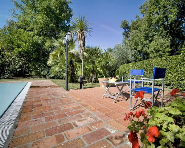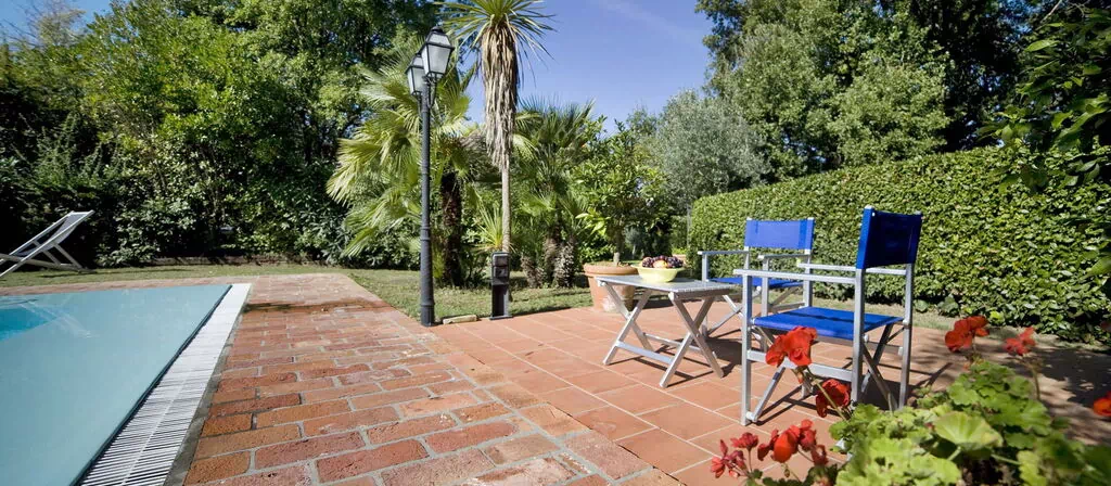 The house, which is located on the same estate as Le Rondini (also in our program), is surrounded by a very large and well maintained flat garden, where an unusually big pool for such a small house is situated. The pool has a salted water filter system avoiding the use of chlorine. The garden is fenced all around, making it very safe for children, and there is also a children’s play area.