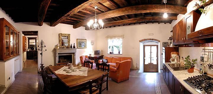 The Loggia apartment (100 sqm) embodies the perfect harmony of modern and antique style. It is composed of a large living room with fireplace and kitchen (equipped with an oven and a dishwasher), 3 double bedrooms and 3 bathrooms with shower (2 of the bathrooms are en suite whereas the 3rd is just outside the bedroom). Special features of this apartment include wood-beam ceilings and furnishings in synchrony with the atmosphere. The private garden is complete with garden furniture.