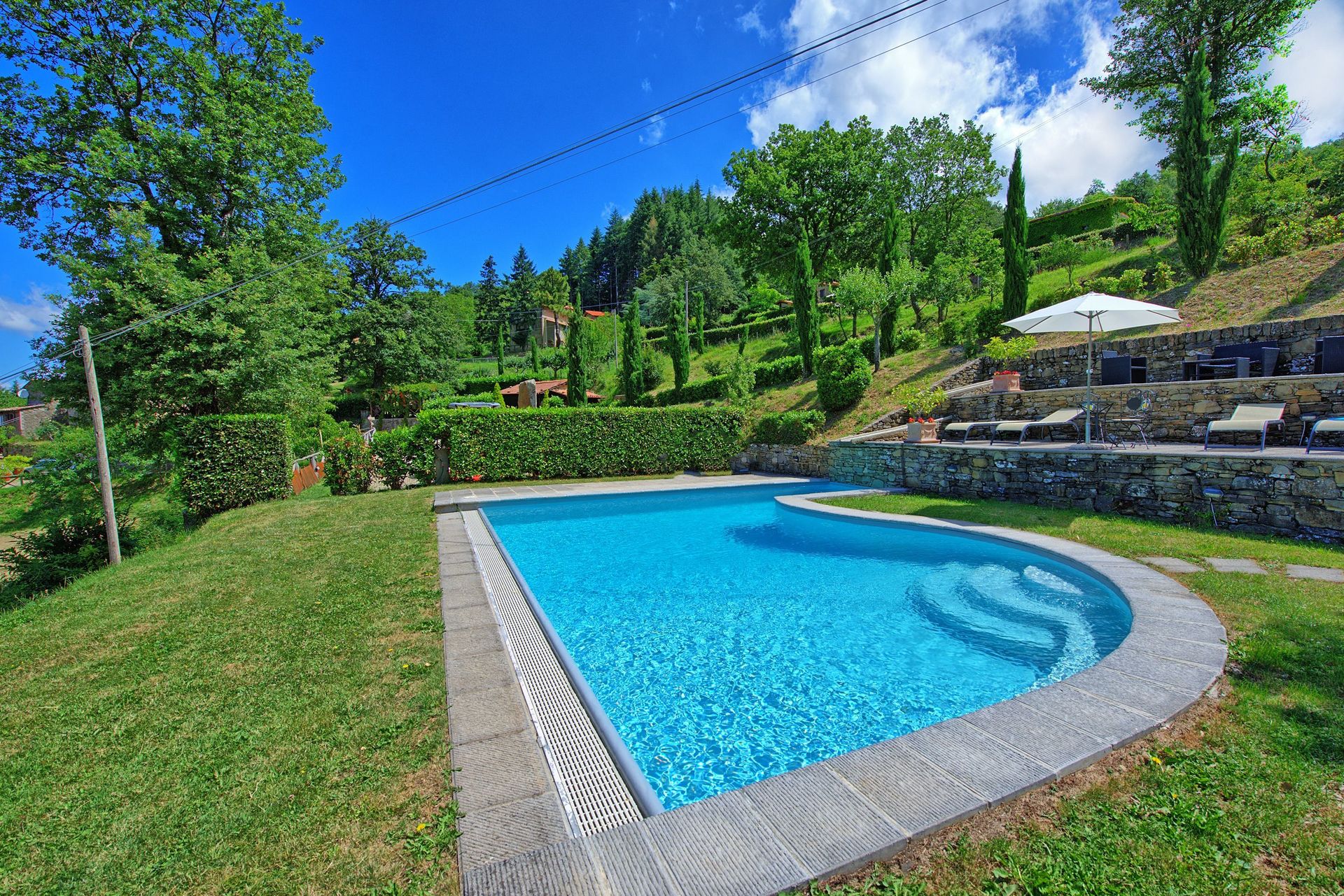 this property comes with the most amazing pool & pool view possible. the pool is deep with also shallow areas. it allows for great playing on a hot day. the terraces and garden furniture provided all allow for blissful summer days. if it weren't for the pool the rating of this property would have been lower. the house is definitely OK, but more worn-out and quite packed with decoration. The first floor outside lounge corner is again a lovey asset and was used daily with pleasure. Property is in the midst of nature. amazing sunsets overlooking the stunning landscape in the pool area...but it comes with a drive on a long winding road on some steeper hills So make sure to buy all you need for breakfast (even salt, coffee & tea) as there is nothing upon arrival and it will take you 30' each way on that hilly rather narrow road to the nearest store