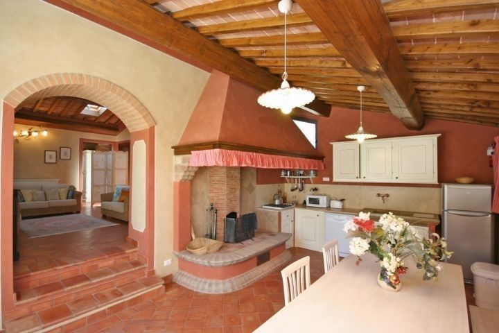Ground floor: living-room (satellite TV), kitchen (freezer, dishwasher, microwaves) with dining area and fireplace.