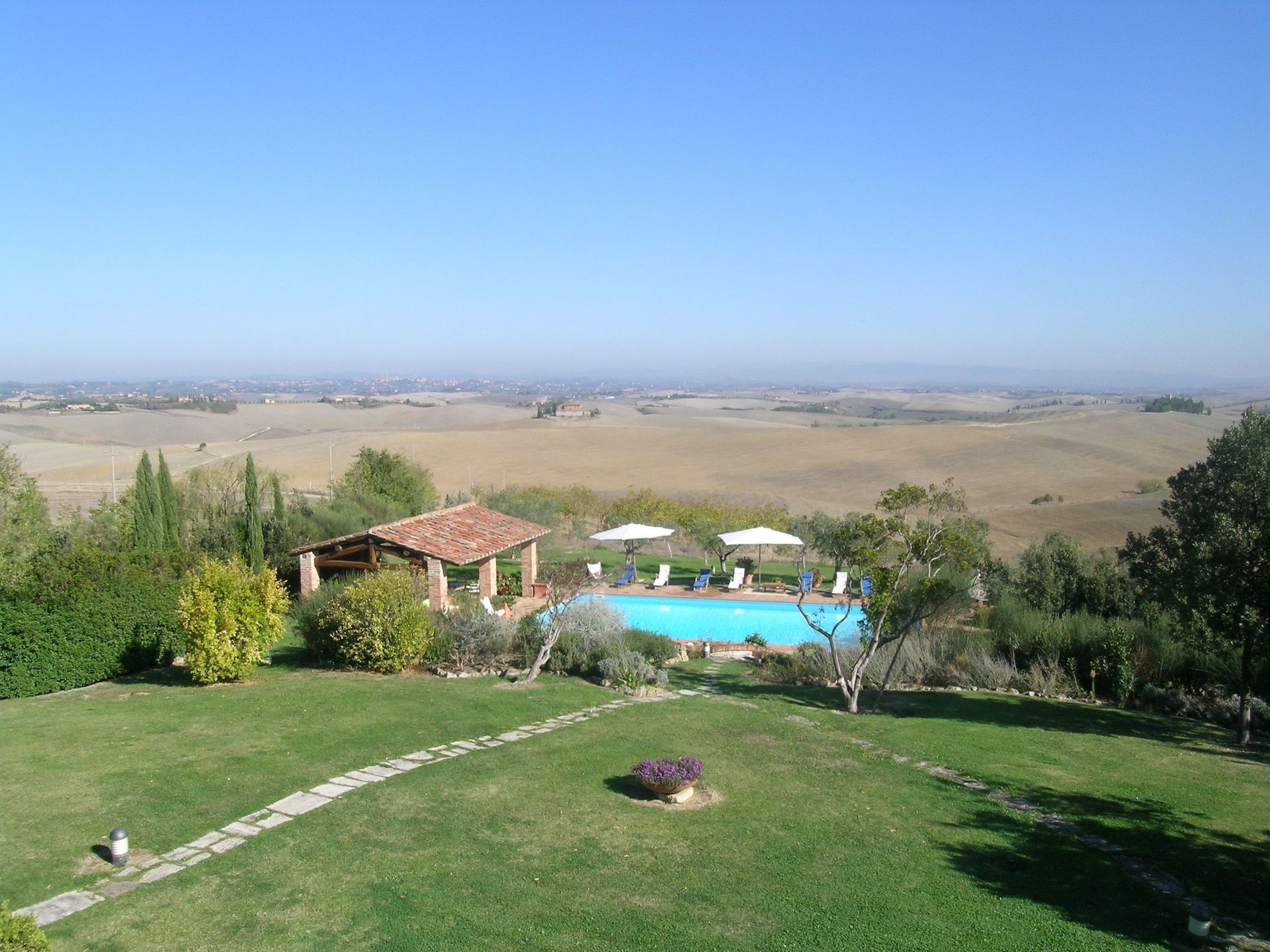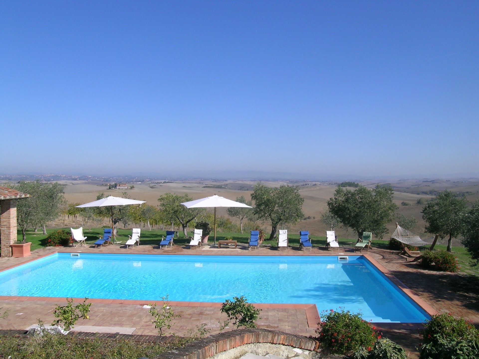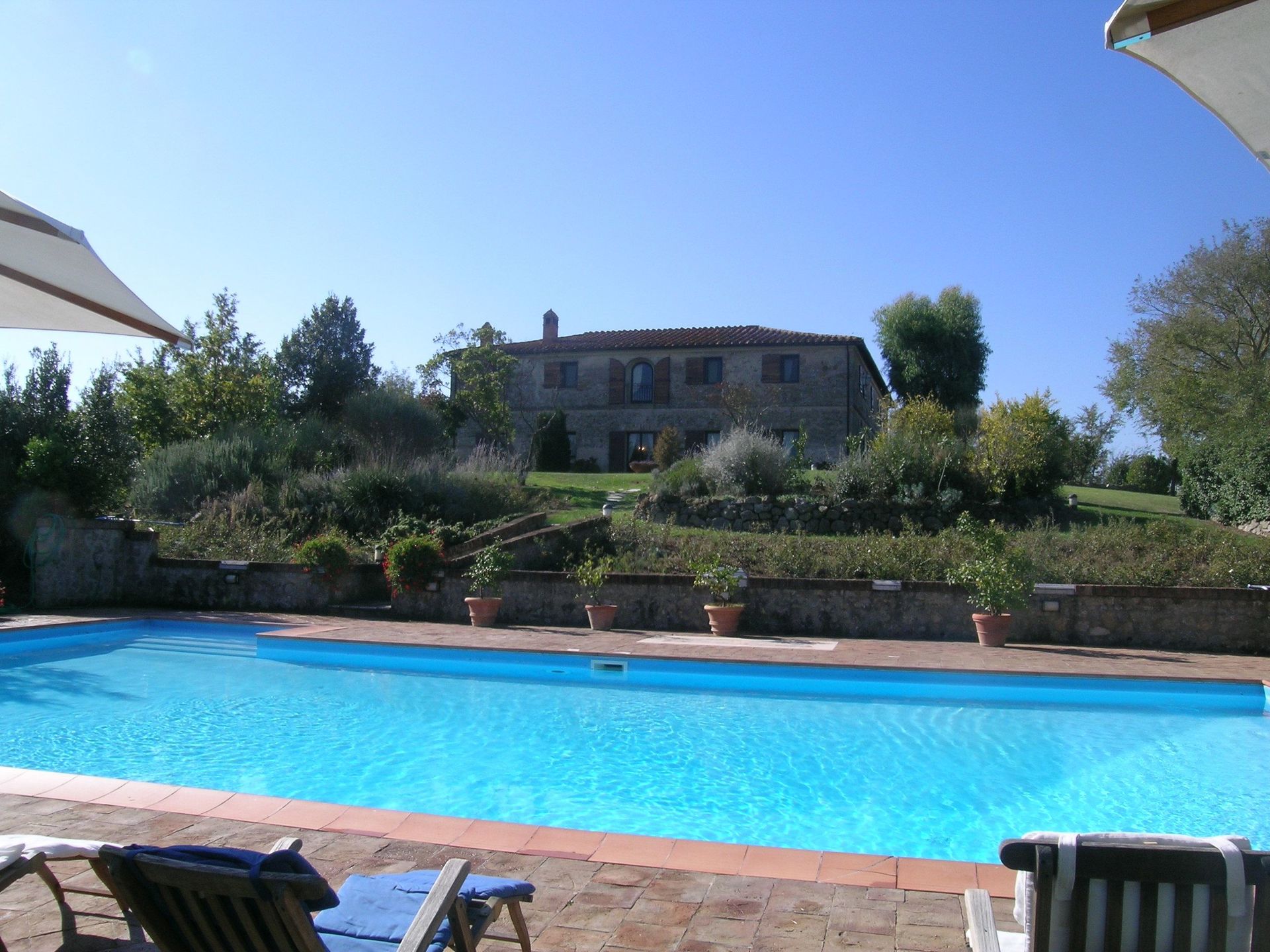 Spacious and beautiful farmhouse with outbuilding and private swimming-pool situated in peaceful location on a large estate enjoying extensive views over the “Crete Senesi” area and Siena in the distance.