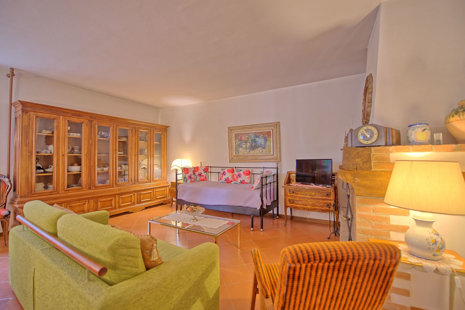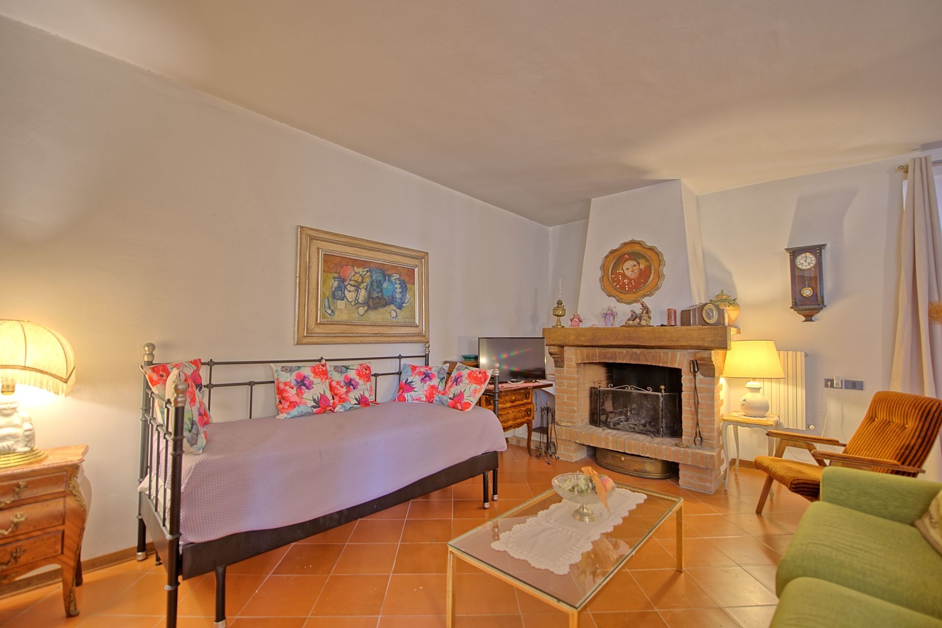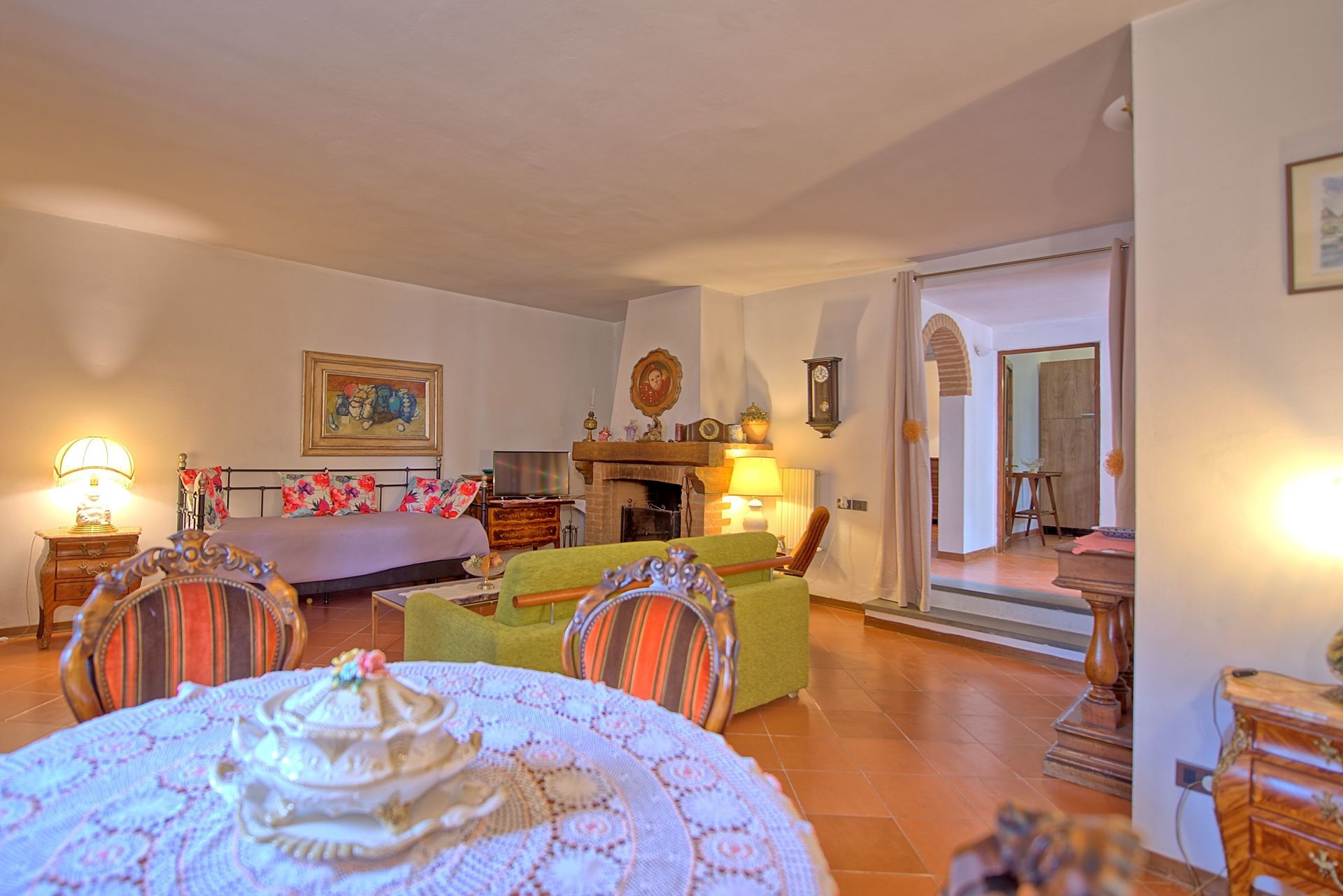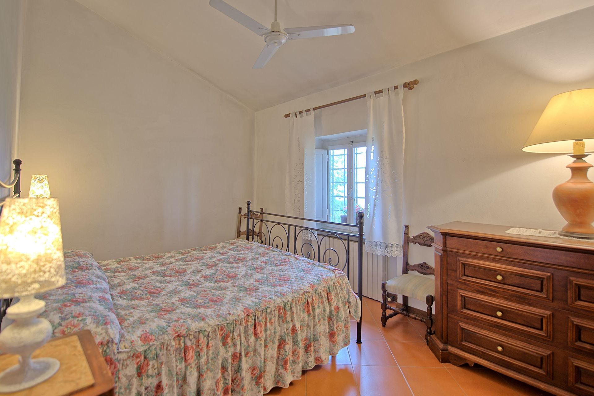 75 m2 Ground floor: kitchen (oven, freezer), double bedroom with ceiling fans, bathroom with shower (washing-machine) without window. 2 steps lower: large living-room (satellite TV) with dining table, 2 single beds and fireplace.
