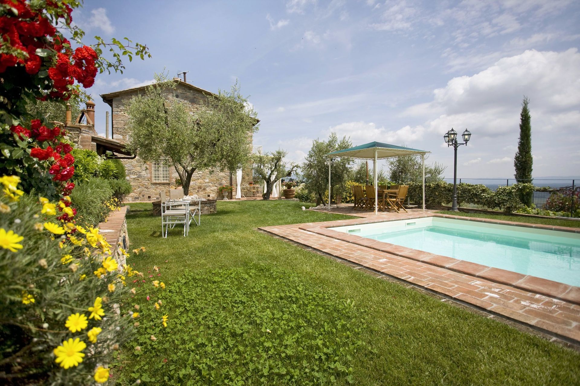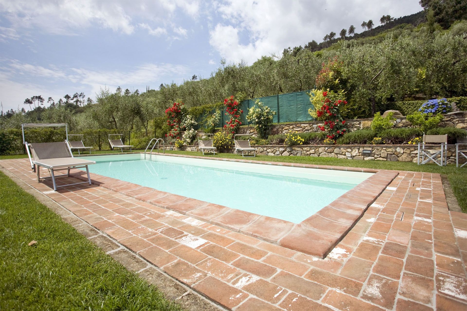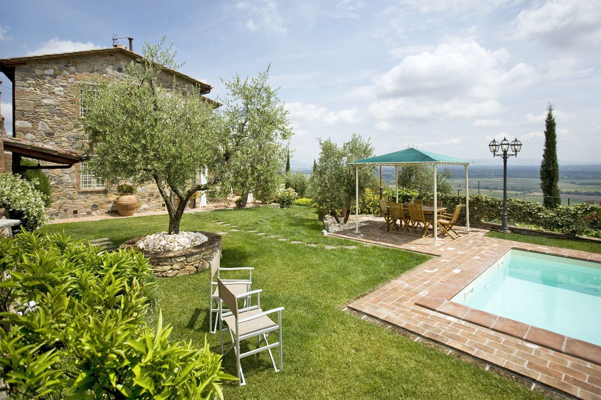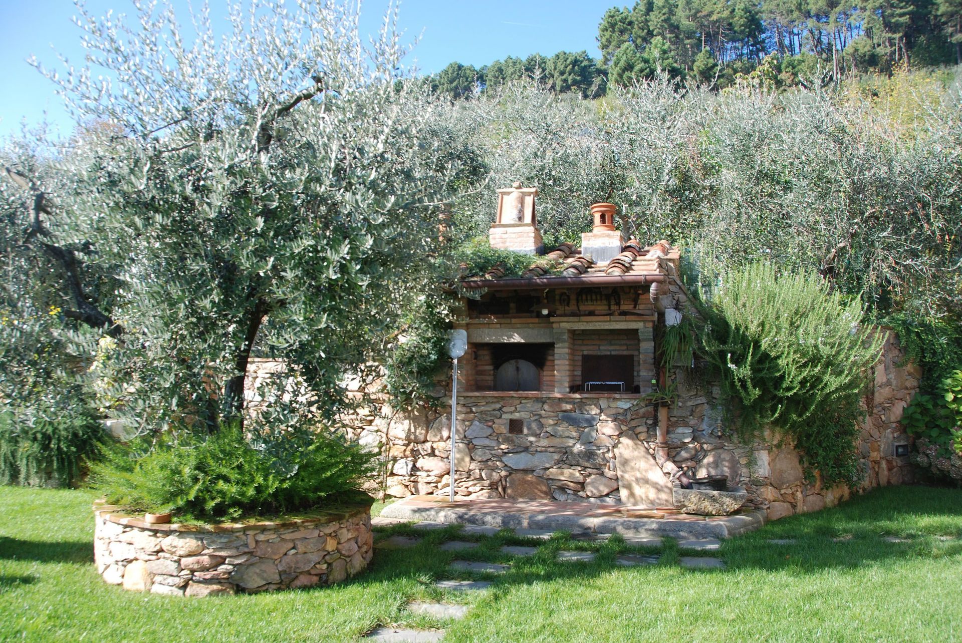 The house is placed in a very quiet position and enjoys magnificent views on the surrounding countryside and the plane below. The outside eating area includes a stone-built barbecue and pizza-oven, where to enjoy outdoor meals with beautiful views. The swimming pool is placed in the most panoramic position on the very well kept garden.