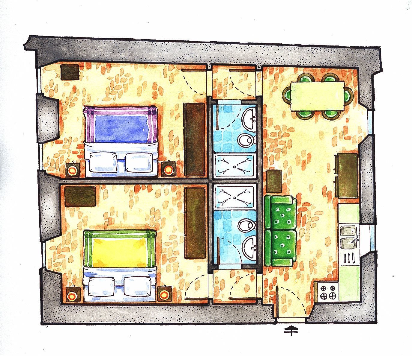 Ideal for two couples, friends or a family, this apartment has two double bedrooms with possibility to add a single bed in one of the bedrooms. Each bedroom has it's own bathroom with shower facilities.