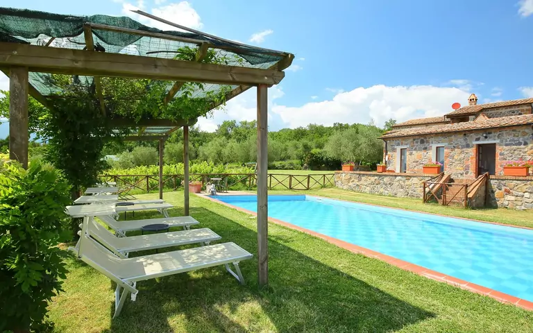 Country house "Val d'Orcia" offers a peaceful vacation rental experience in the heart of Radicofani, Italy. Perched atop a hill surrounded by fields and vineyards, this detached country house boasts a sunny position and stunning countryside views. You'll enjoy exclusive access to a terraced garden, swimming pool (seasonal from May 1st to October 15th), and other amenities like Internet WiFi, a yard, and parking.