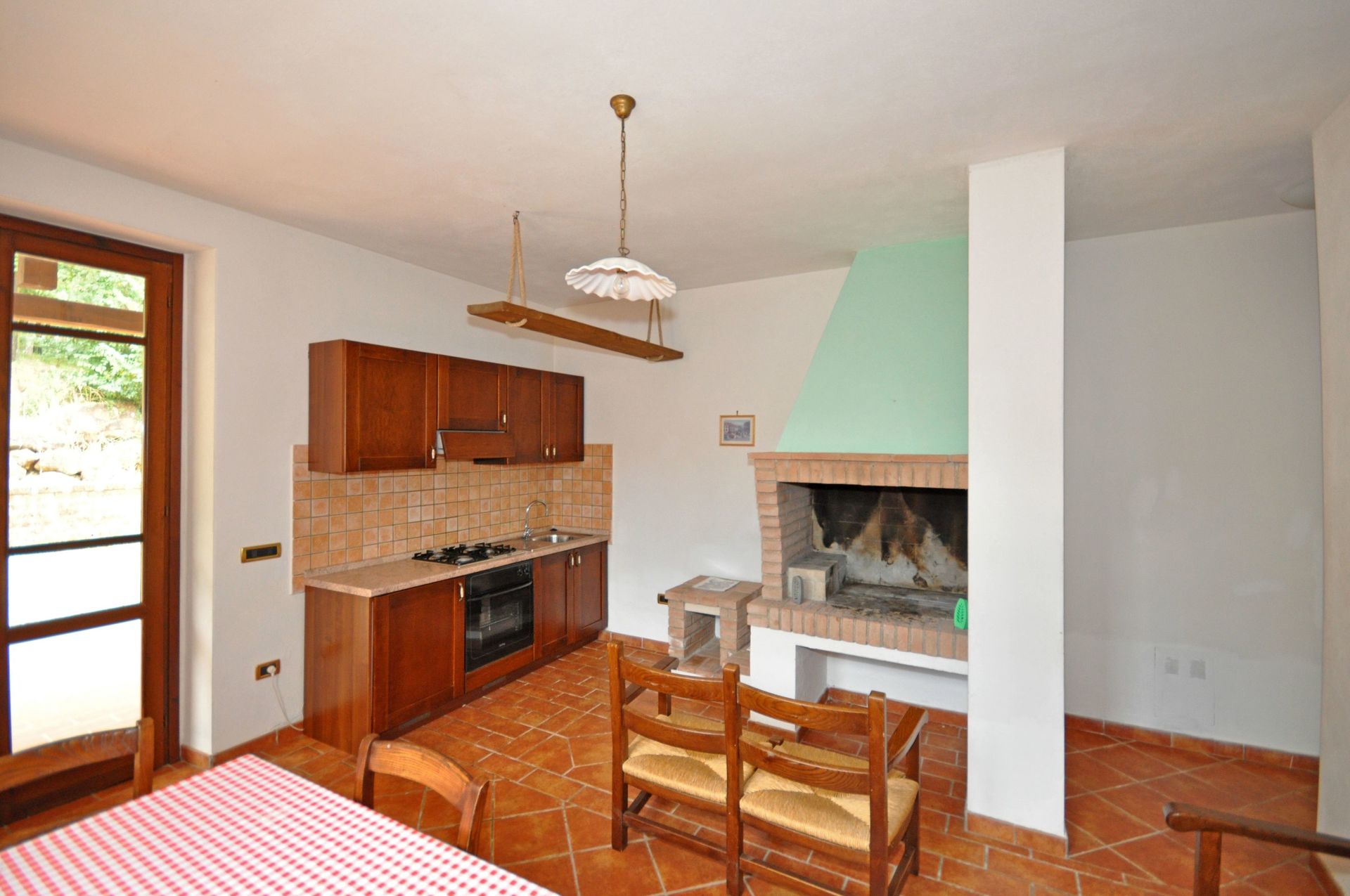 Ground floor: dining area (satellite TV) with fireplace and kitchen corner (oven, small freezer), 2 double bedrooms, bathroom with shower.