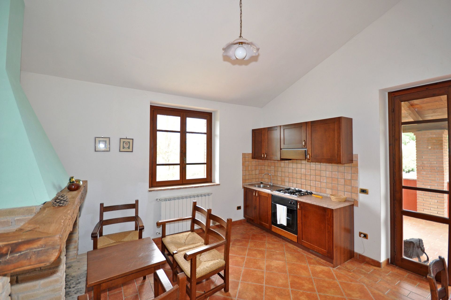 1st floor: dining area (satellite TV) with fireplace and kitchen corner (oven, small freezer).