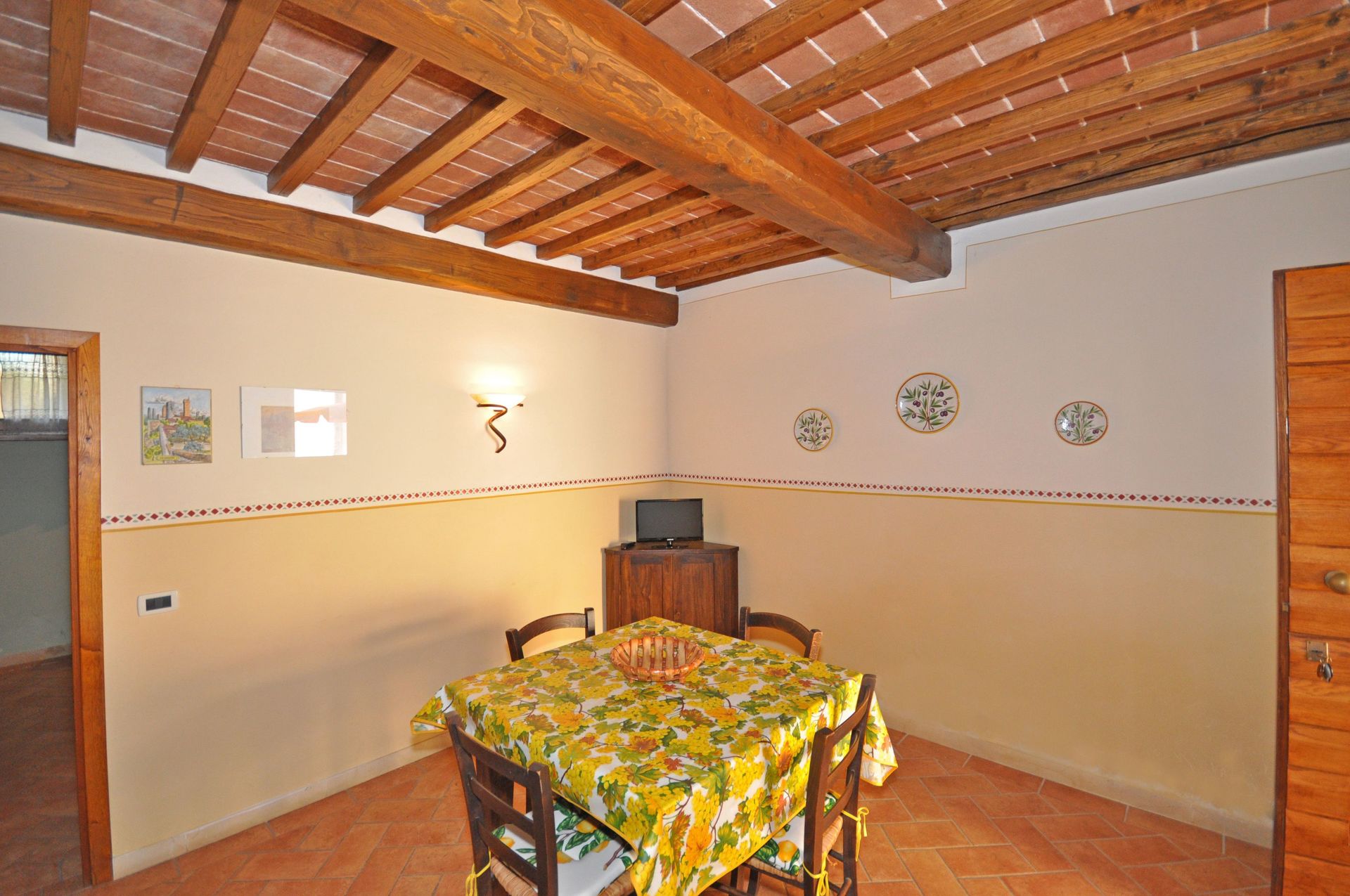 Mezzanine ground floor: dining area (TV) with kitchen corner (oven, freezer, dishwasher), double bedroom with ensuite bathroom with shower (accessible going down 2 steps).