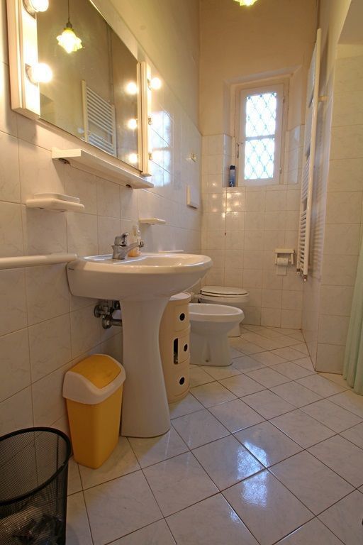 Bathroom 1: basin, toilet, bidet, bathtub.