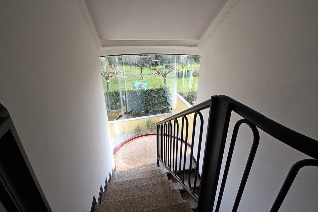 Entrance into the living room (dining table, 2 sofas, TV) next to the rear, a small kitchen (with door to the outside), utility room and bathroom. The staircase is secured for small children (the staircase wall is made of glass), on the first floor is a smaller bedroom with smaller double bed and a small balcony, a little further a larger bedroom with double bed, balcony and a walk-in closet.