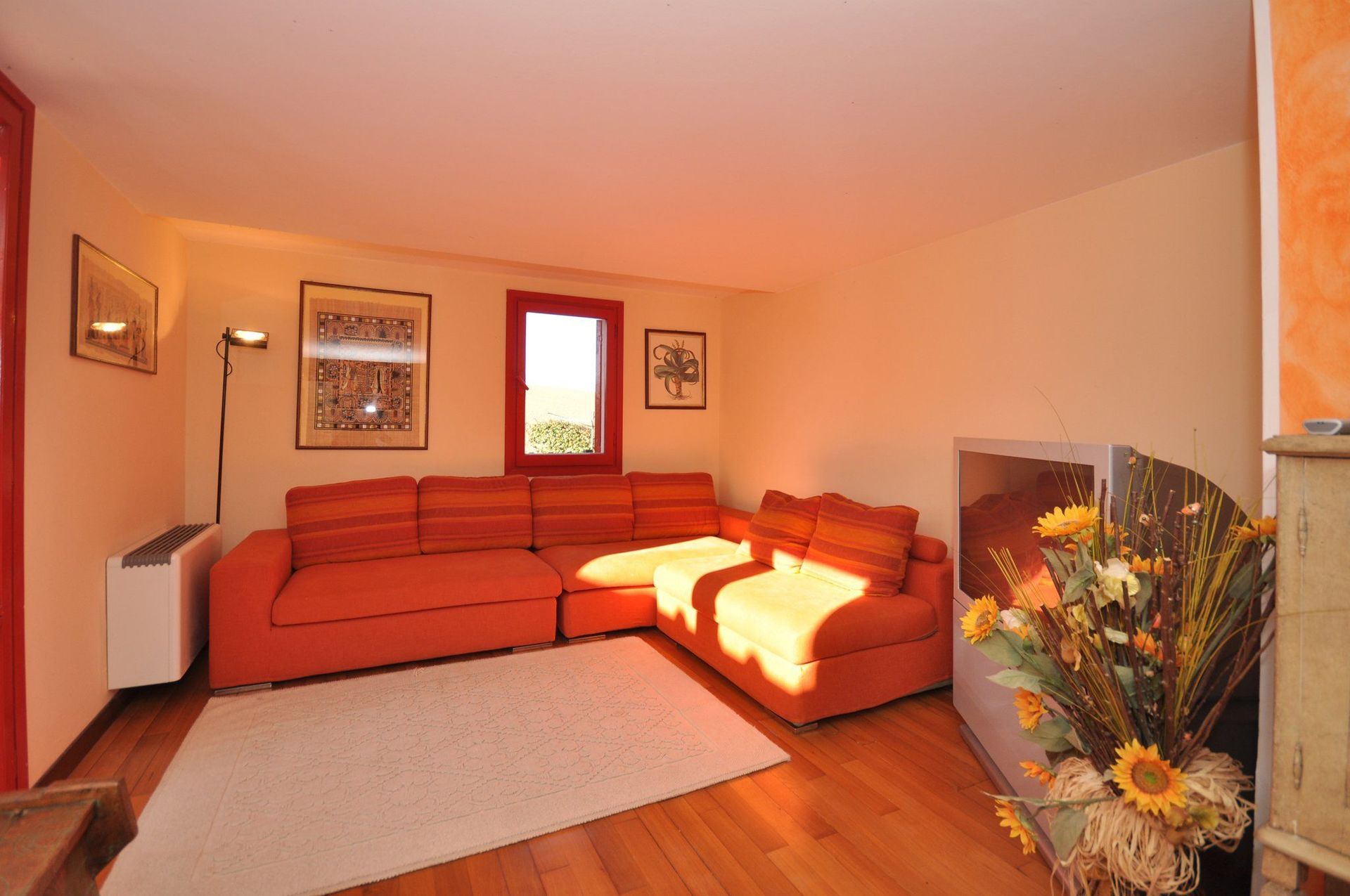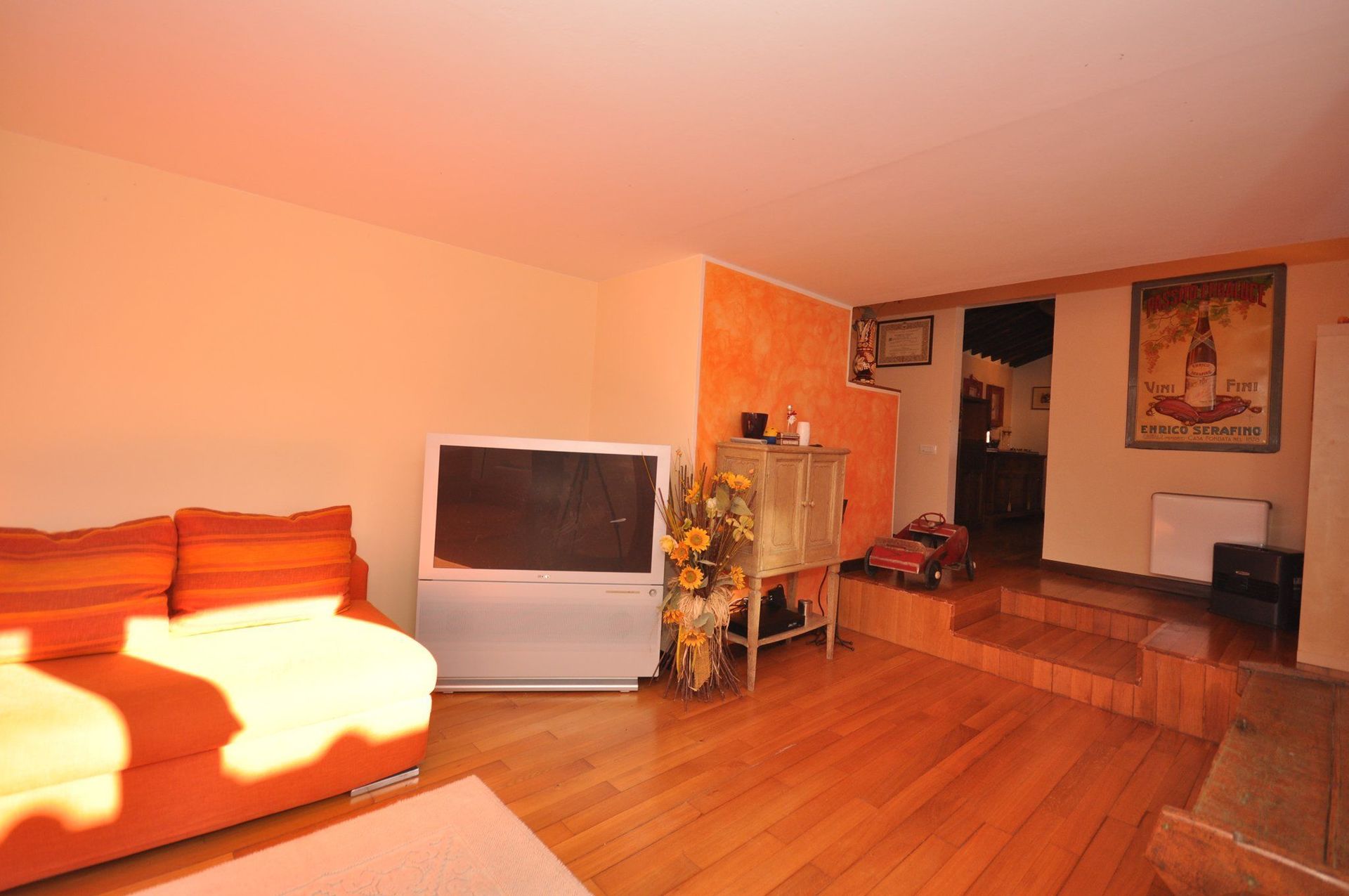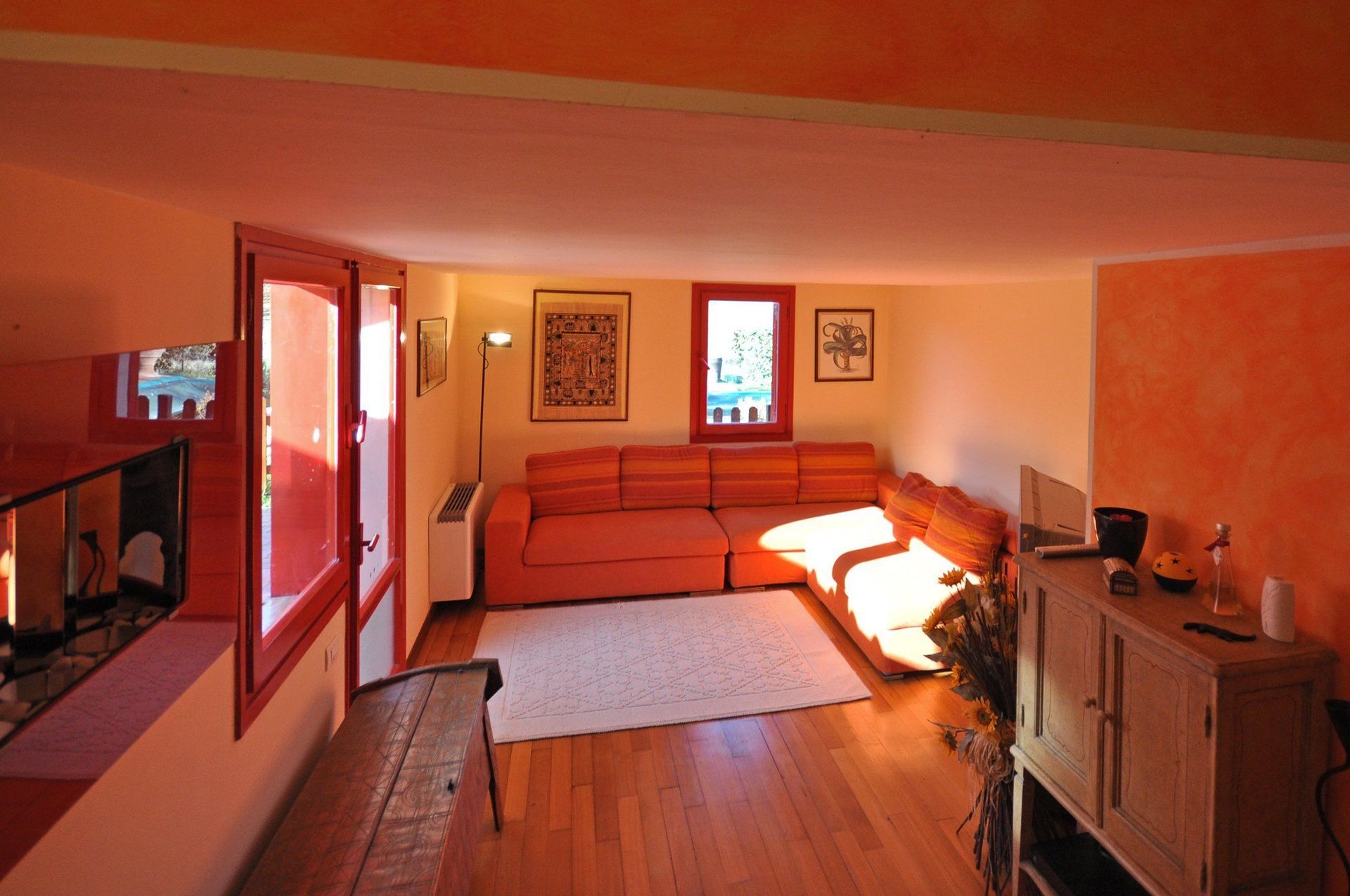 2 steps down: living-room (satellite TV) with access on to the outside.