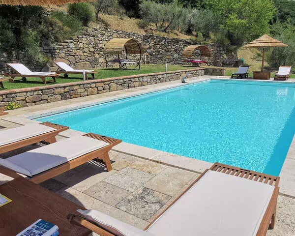The villa comprises a main building for 8 persons and an outbuilding situated by the pool for 2 persons (with 1 bedroom, 1 bathroom, changing room for the pool and bathroom with shower).