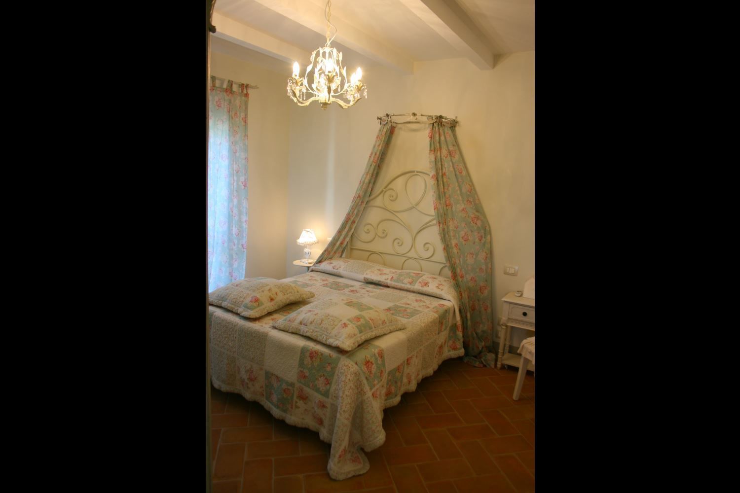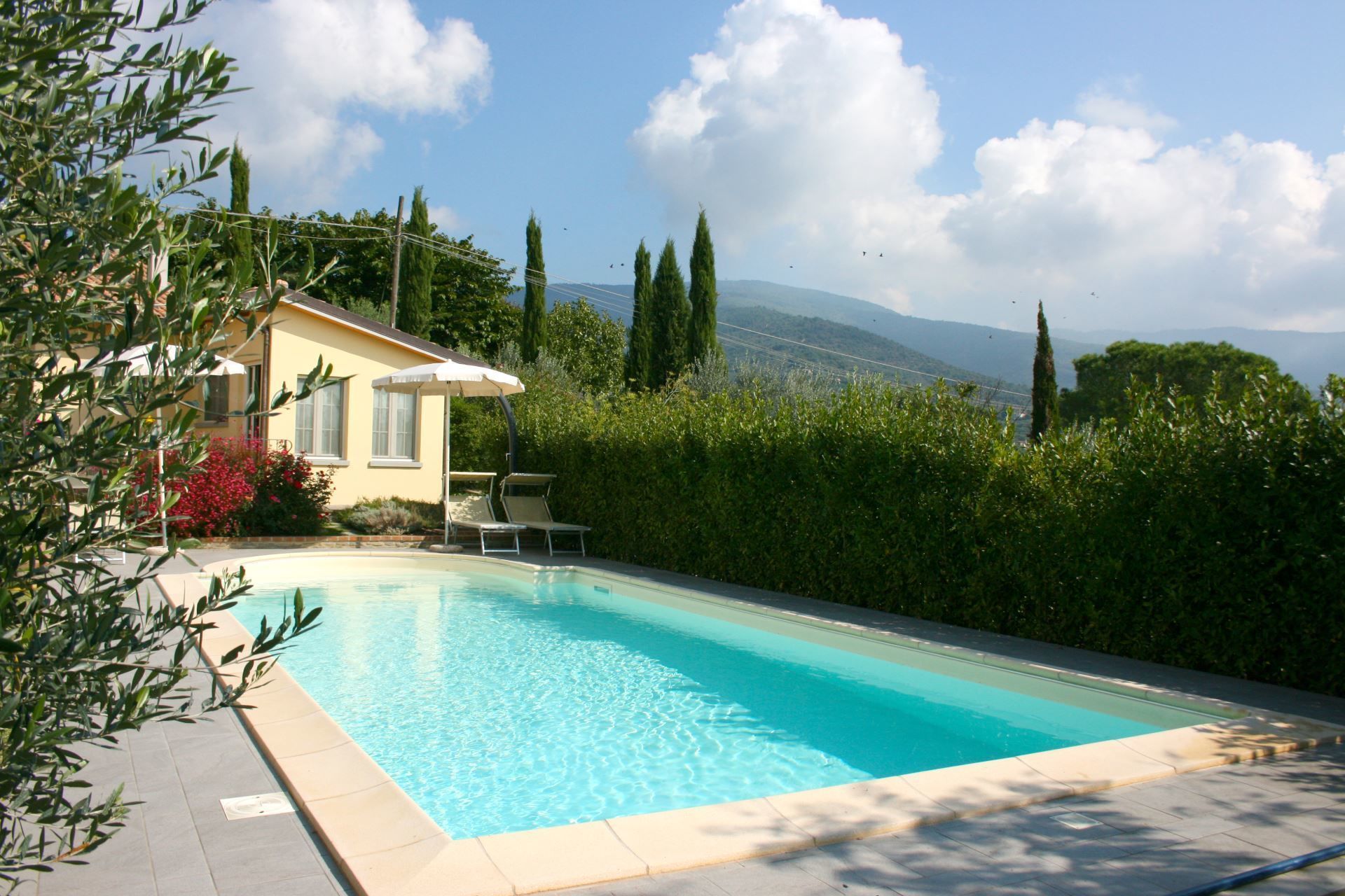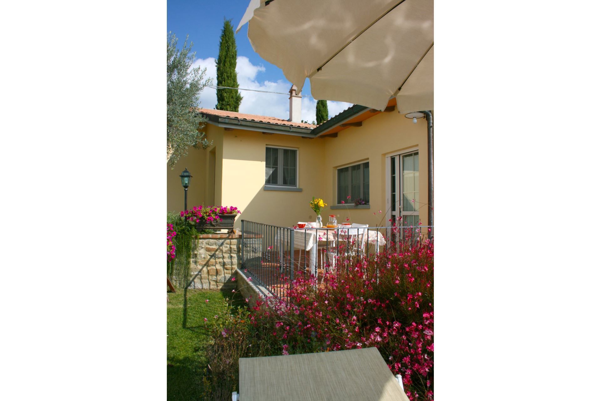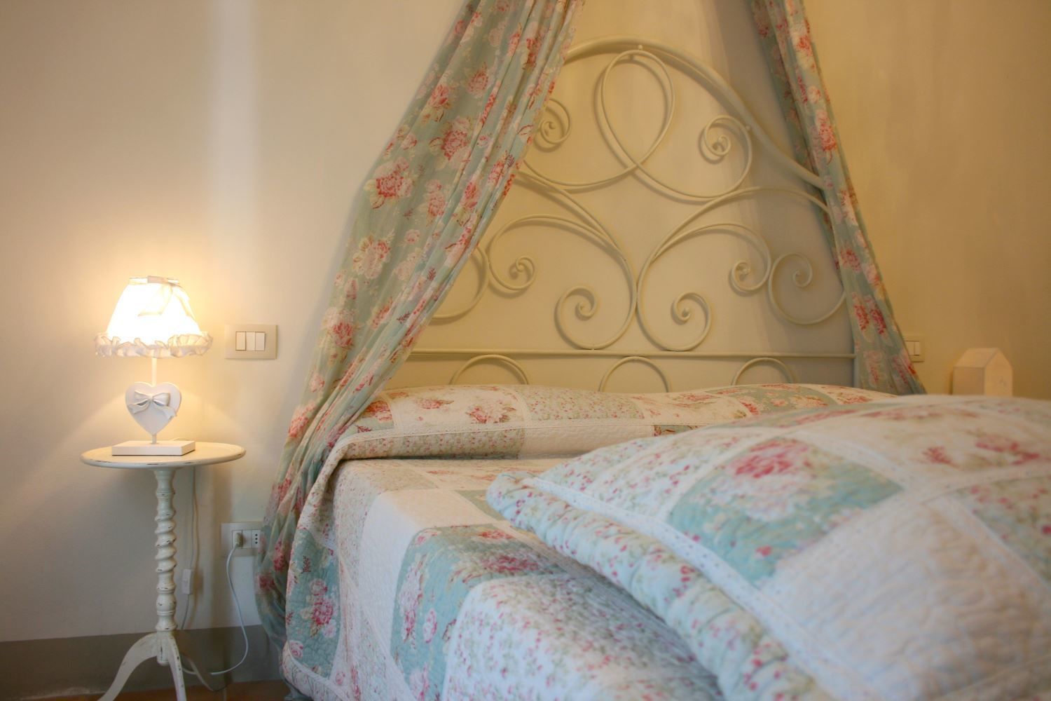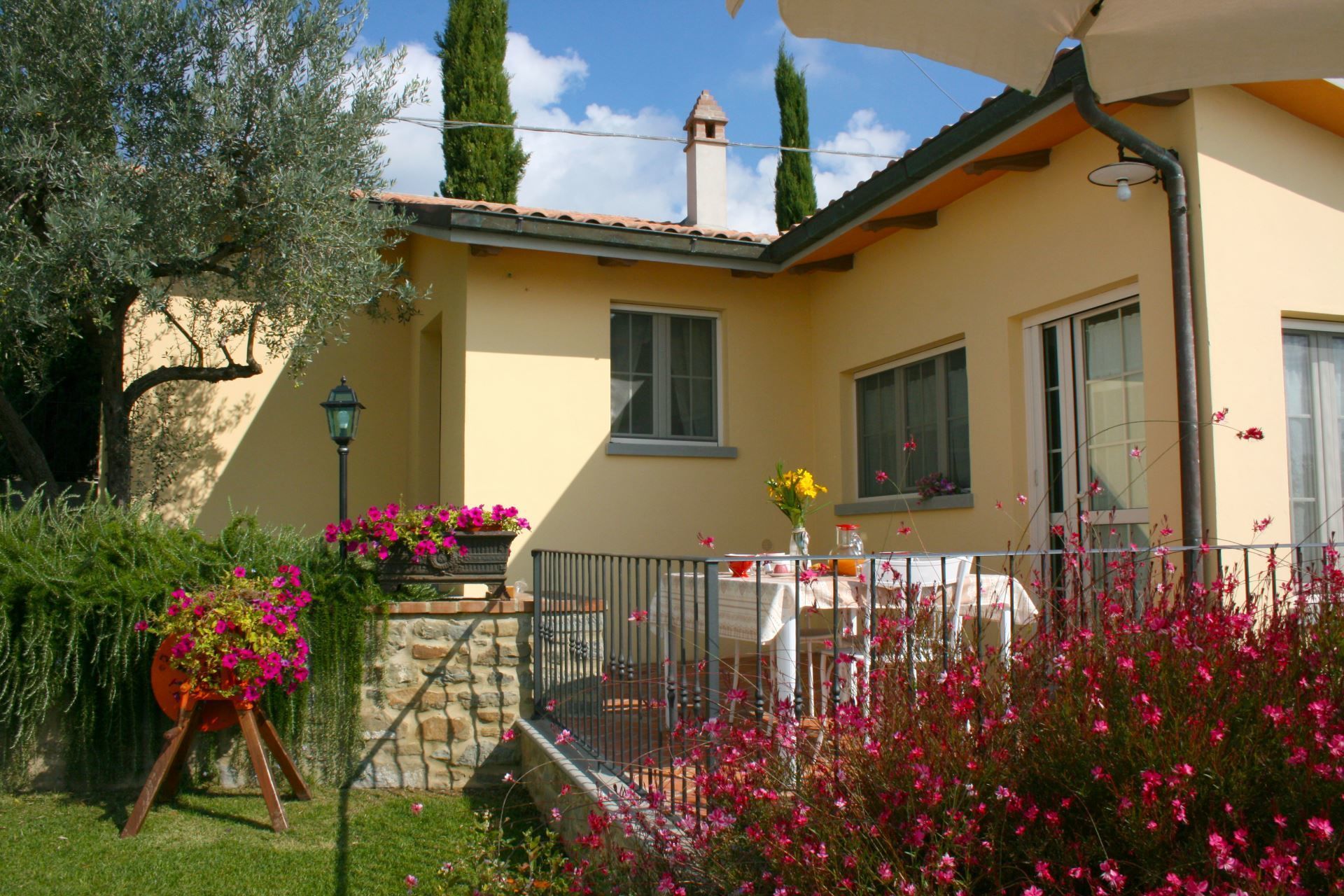 Picture this, if you will: a pretty villa in a small town with the lush greenery of trees and views over the vineyards and rolling hills of the Tuscan countryside all around, a front entrance opening into a little court with flowers and trees, climbing blooms and vines winding up the sunny yellow facade of the villa, green shuttered windows, a romantic balcony on the first floor above the entrance, and a terracotta roof to top it off. This is the dreamy first encounter that guests have when they reach Villa Toppani Del Sodo and this very much sets the appropriate tone for your vacation here.