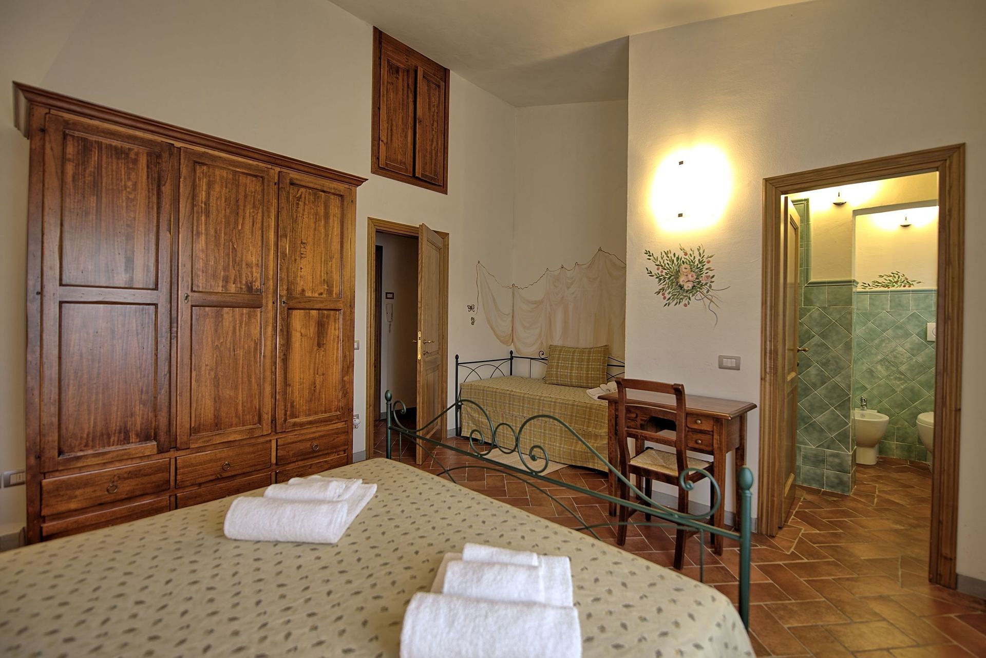 First floor: bedroom with double bed and extra single bed with en-suite shower room, twin bedroom with en-suite shower room.